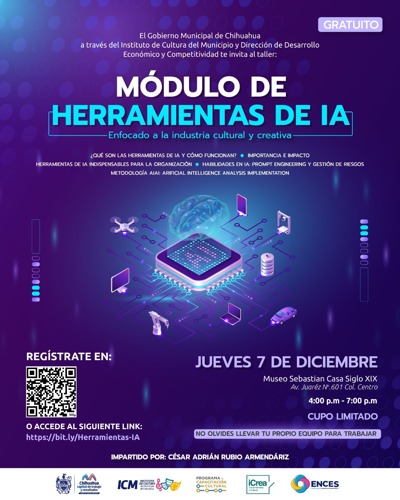 Chihuahua, Chih. A 08 diciembre del 2023.- Como parte de las actividades de la Subdirección de Gestión y Proyectos del Instituto de Cultura del Municipio (ICM) en busca de la profesionalización de los artistas y creadores de Chihuahua Capital, se abrió el primer grupo para el Módulo I de Herramientas de Inteligencia Artificial este jueves 7 de diciembre con un cupo lleno en la Sala Guirnalda del Museo Sebastian Casa Siglo XIX.
