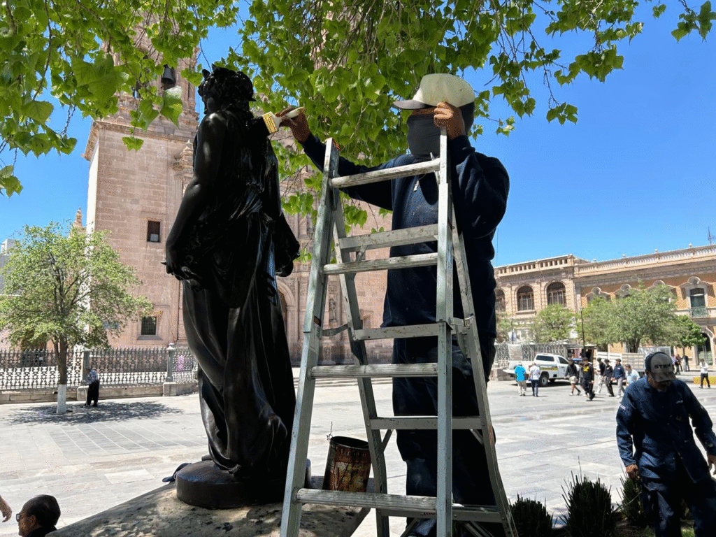 Trabajos de restauración y mantenimiento se llevan a cabo en las cuatro estatuas de bronce que adornan la Plaza de Armas del centro histórico de Chihuahua capital. Personal especializado aplica cera con ayuda de calor para preservar el acabado de las esculturas, las cuales fueron fundidas en Francia por la prestigiosa casa Val d’Osne y colocadas en la plaza entre 1892 y 1903, durante la administración del gobernador Miguel Ahumada.