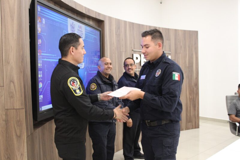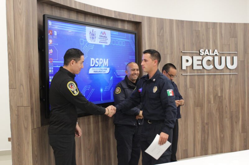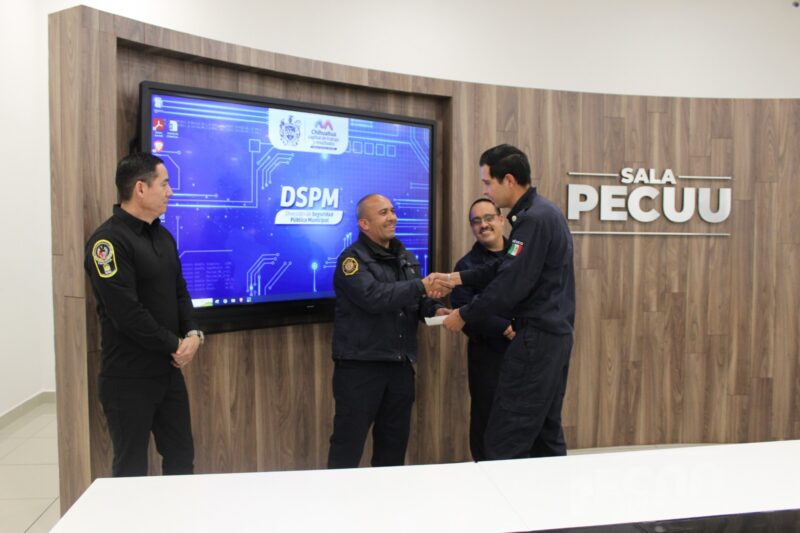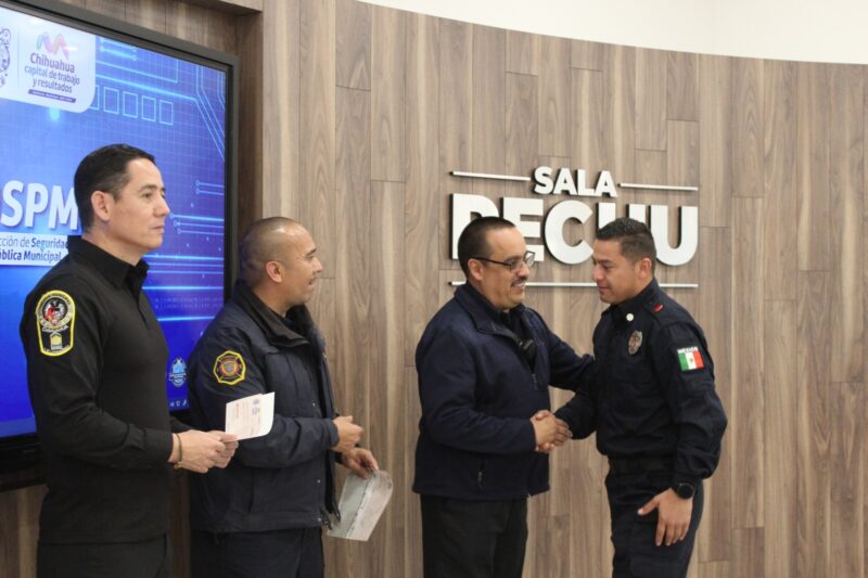 Chihuahua, Chih. A 26 de febrero de 2024.- La Dirección de Seguridad Pública Municipal, hizo entrega de estímulos económicos a 32 policías y bomberos que fueron seleccionados por miembros de su respectiva Comisión del Servicio Profesional de Carrera, con la intención de reconocer su actuación destacada y fortalecer la identidad institucional.