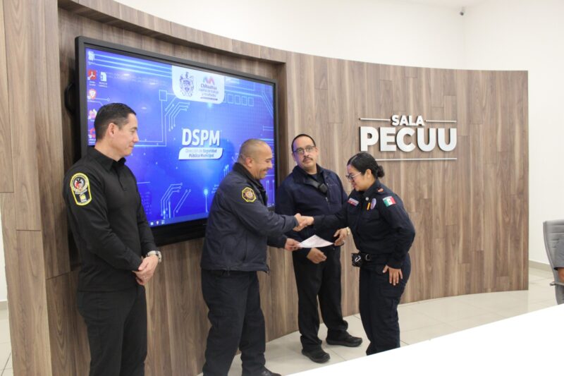 La entrega de estímulos económicos por trabajos de alto impacto, se lleva a cabo mes por mes y aunque los casos se van acumulando, se realiza una ceremonia especial en la que las autoridades de seguridad hacen la entrega de los cheques correspondientes, como en esta ocasión que presidió el jefe de la Policía Municipal Julio César Salas, acompañado de subdirectores operativos en la sala PECUU de comandancia Norte.