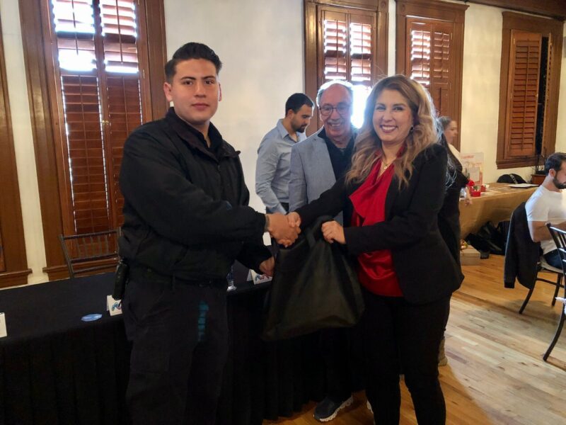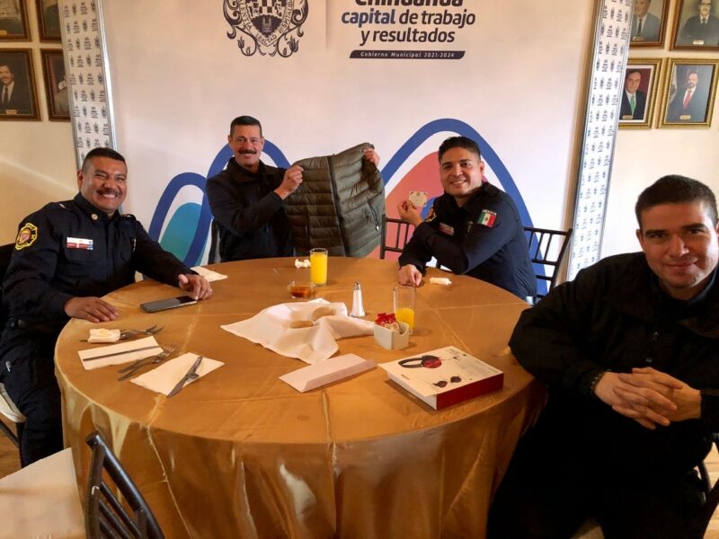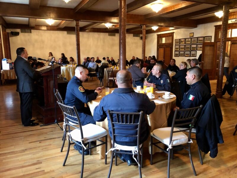 Chihuahua, Chih. A 13 de diciembre de 2023.- Elementos de policía y bomberos de la Dirección de Seguridad Pública Municipal, fueron reconocidos por la Asociación de Comerciantes del Centro (COCENTRO) durante el tradicional desayuno anual que el organismo efectúa cada año, para felicitar su trabajo diario.