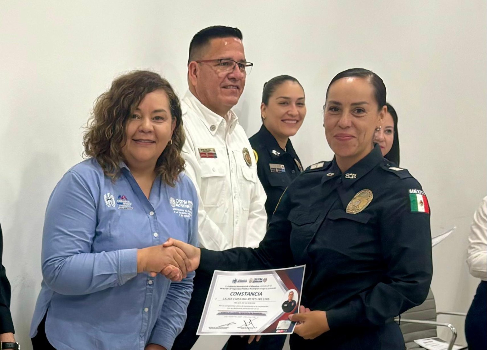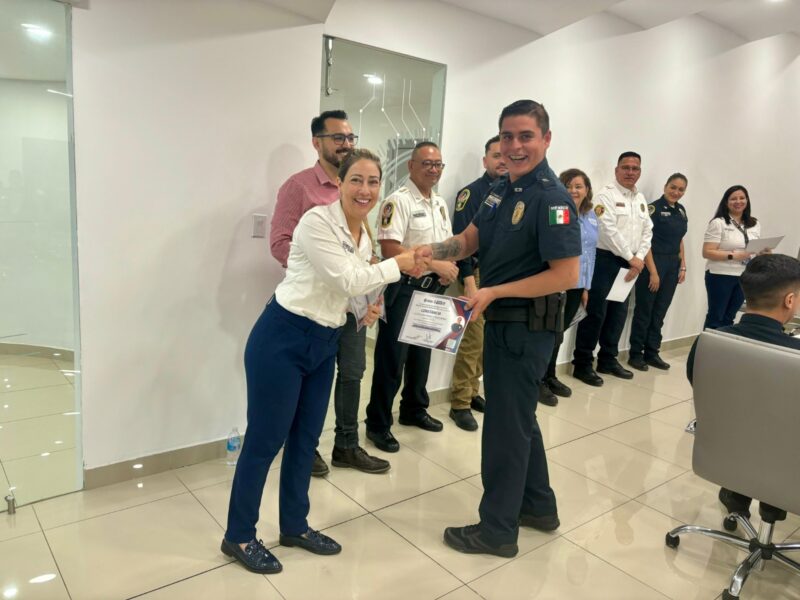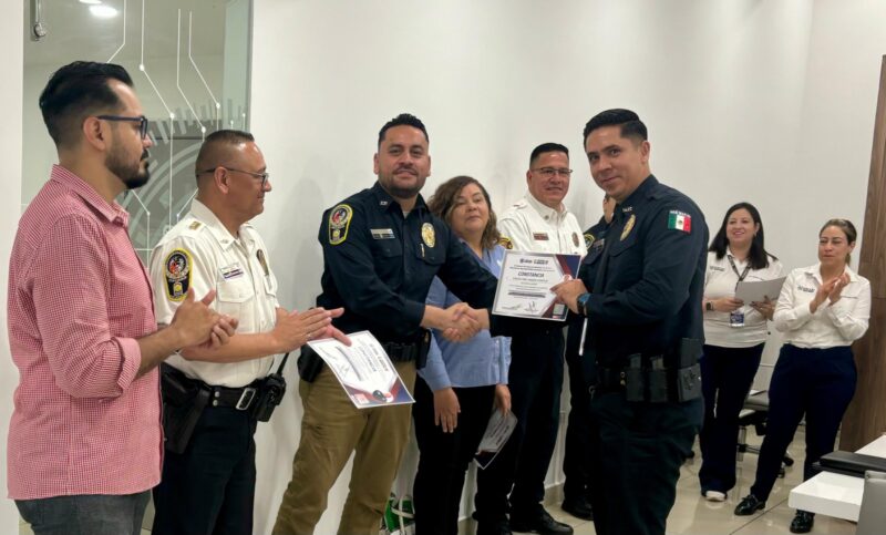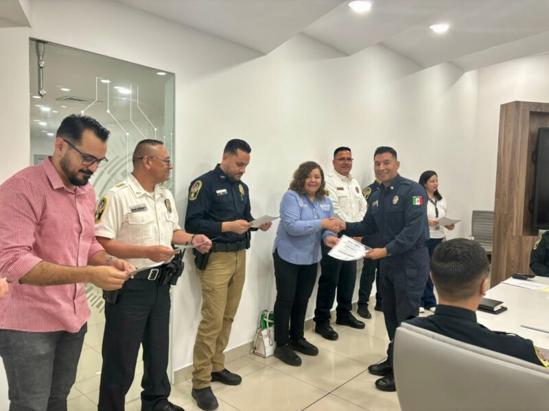 Chihuahua, Chih. A 23 de julio de 2024.- Para incentivarlos a continuar ofreciendo su tiempo, esfuerzo y dedicación de manera voluntaria en beneficio de la Dirección de Seguridad Pública y la comunidad chihuahuense, policías municipales y bomberos pertenecientes a la Banda de Guerra y Escolta, recibieron un reconocimiento por parte del Instituto Superior de Seguridad Chihuahua (ISSCUU) por dar identidad a la dependencia a la cual pertenecen.