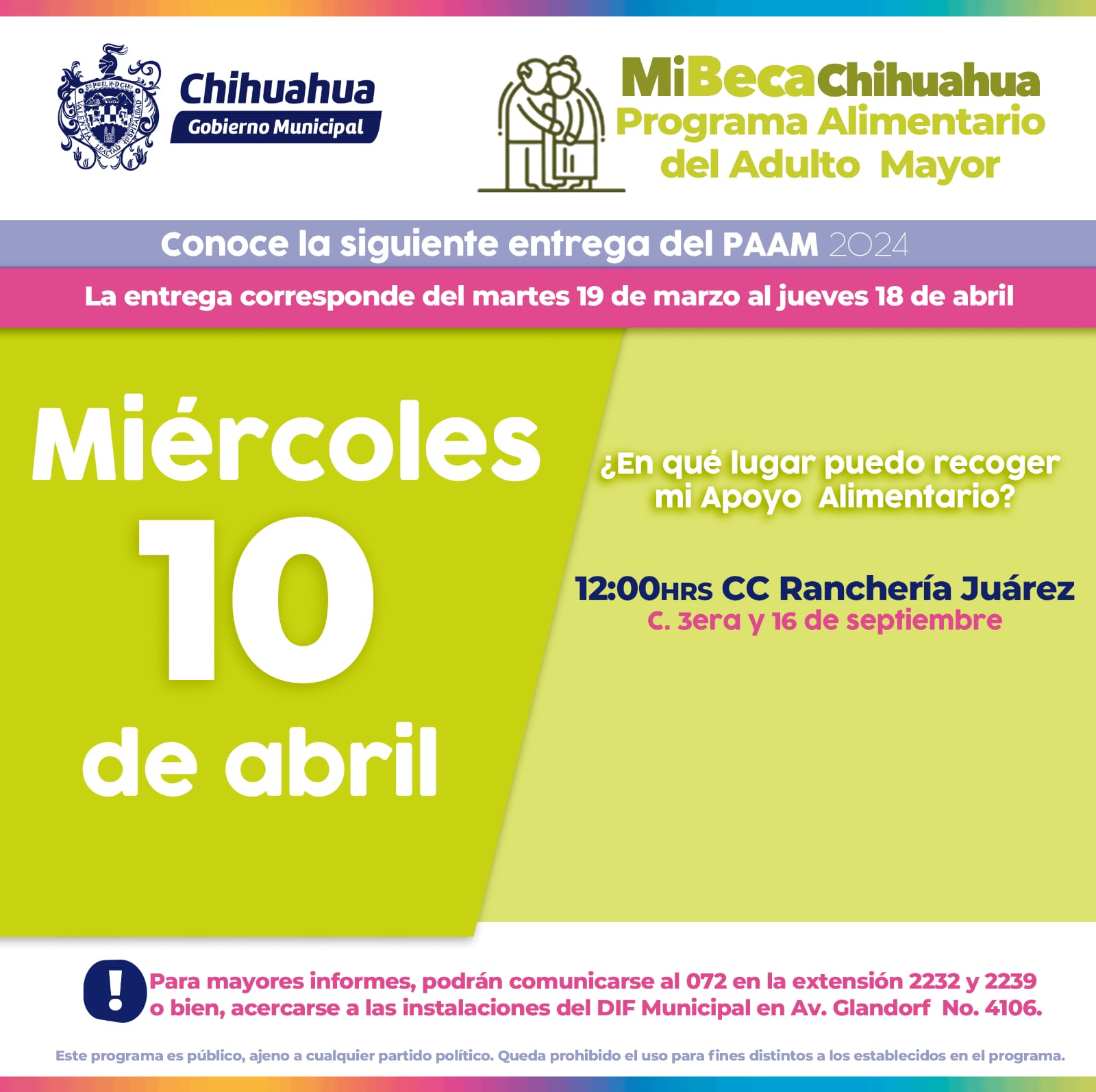 Chihuahua, Chih. A 9 de abril de 2024.- El Gobierno Municipal, a través del DIF, informa a las y los seleccionados del Programa Alimentario del Adulto Mayor (PAAM) que podrán acudir por su paquete alimentario este miércoles 10 de abril en el centro comunitario Ranchería Juárez a las 12:00 horas.