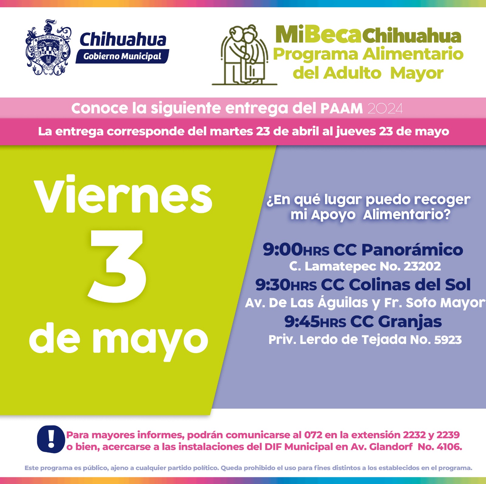 Chihuahua, Chih. A 2 de mayo de 2024.- El Gobierno Municipal, a través del DIF, informa a las y los seleccionados del Programa Alimentario del Adulto Mayor (PAAM) que podrán acudir por su paquete alimentario este viernes 3 de mayo, a los centros comunitarios: