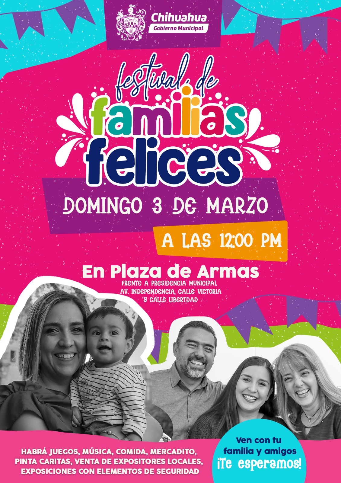 Chihuahua, Chih. A 01 de marzo de 2024.- El Gobierno Municipal, a través del DIF, reitera la invitación al “Festival Familias Felices”, en su segunda emisión que se realizará en la Plaza de Armas, en el Centro de la ciudad, el próximo domingo 3 de marzo a partir de las 12:00 pm, como parte de las actividades en el marco del Mes de la Familia.