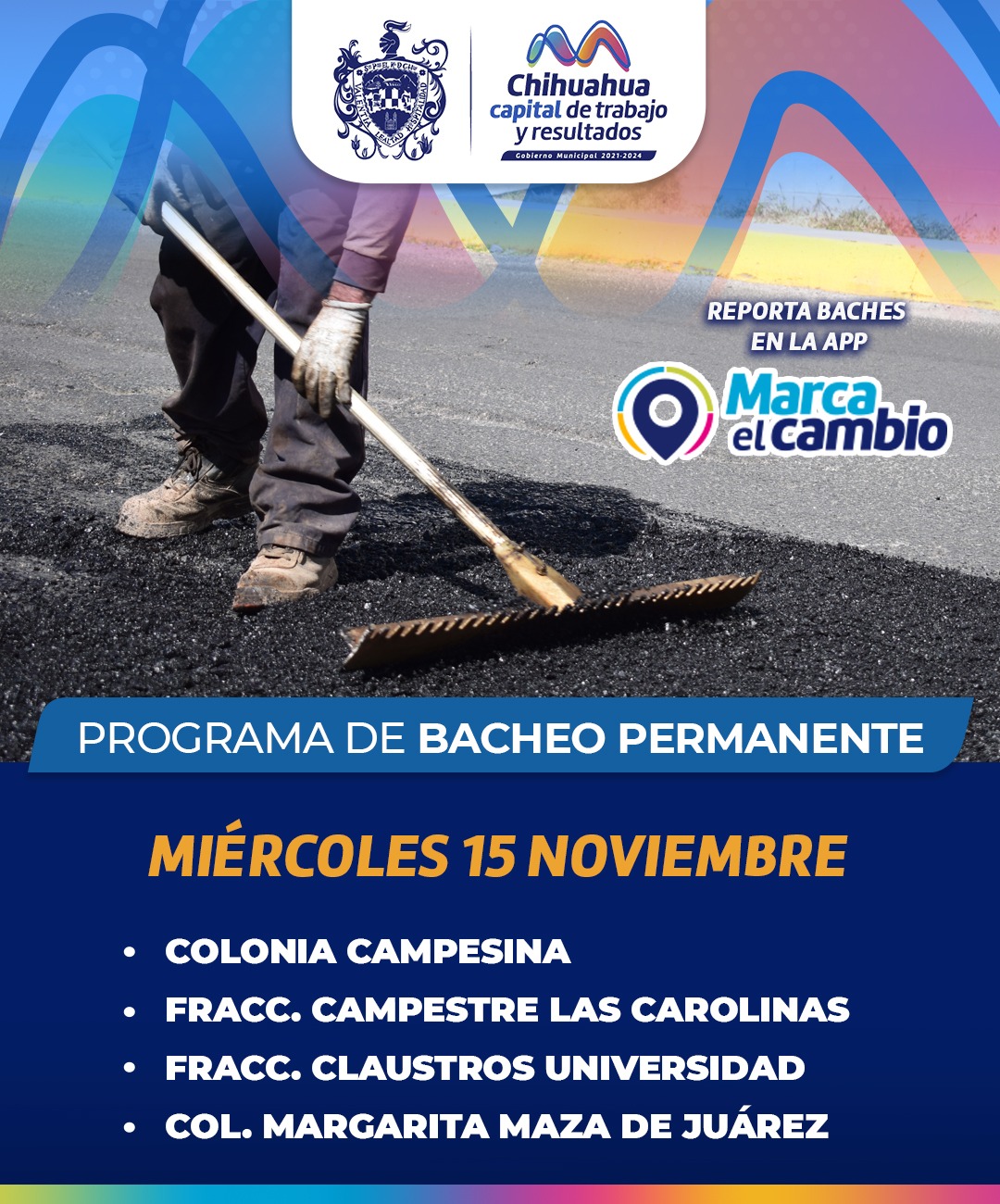 El Gobierno Municipal, por medio de la Dirección de Obras Públicas, bacheará hoy 15 de noviembre estas colonias: Campesina, Margarita Maza de Juárez, y en los fraccionamientos Campestre las Carolinas y Claustros Universidad; por lo que se exhorta a transitar con precaución por las zonas de trabajo a fin de evitar contratiempos.