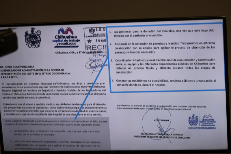 El regidor Luis Alfredo Navarrete, quien es también derechohabiente del ISSSTE, detalló que el Ayuntamiento de Chihuahua, encabezado por el alcalde Marco Bonilla, ha ofrecido tres terrenos distintos en los últimos tres años para la construcción de un nuevo hospital. Además, gracias a gestiones del Sindicato Nacional de Trabajadores de la Educación (SNTE) y el gobierno municipal, un particular ha donado un terreno de más de ocho hectáreas que cumple con todos los requisitos técnicos para el proyecto.