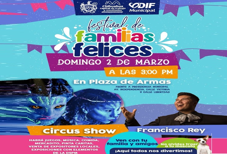 Chihuahua, Chih., a 01 de marzo de 2025.- El DIF Municipal, reitera la invitación al “Festival Familias Felices”, que tendrá lugar en el Centro Histórico mañana 2 de marzo, a partir de las 3:00 pm, en el marco del Día de la Familia.