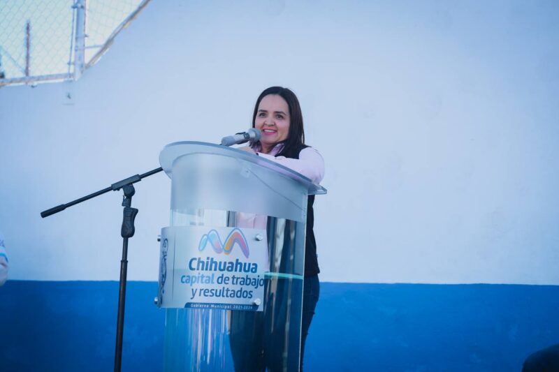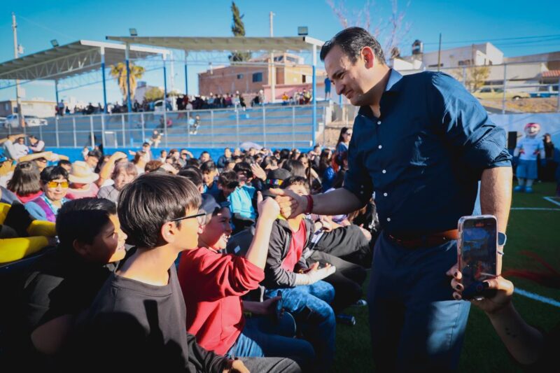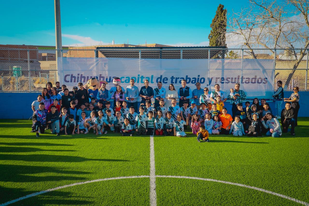 Chihuahua, Chih. A 22 de febrero de 2024.- La tarde de ayer miércoles, el alcalde Marco Bonilla Mendoza, entregó la cancha de la colonia Ignacio Allende, totalmente remodelada con pasto sintético entre otras obras, para beneficiar a los equipos de futbol que por tradición entrenan y juegan en este lugar desde hace más de 40 años.