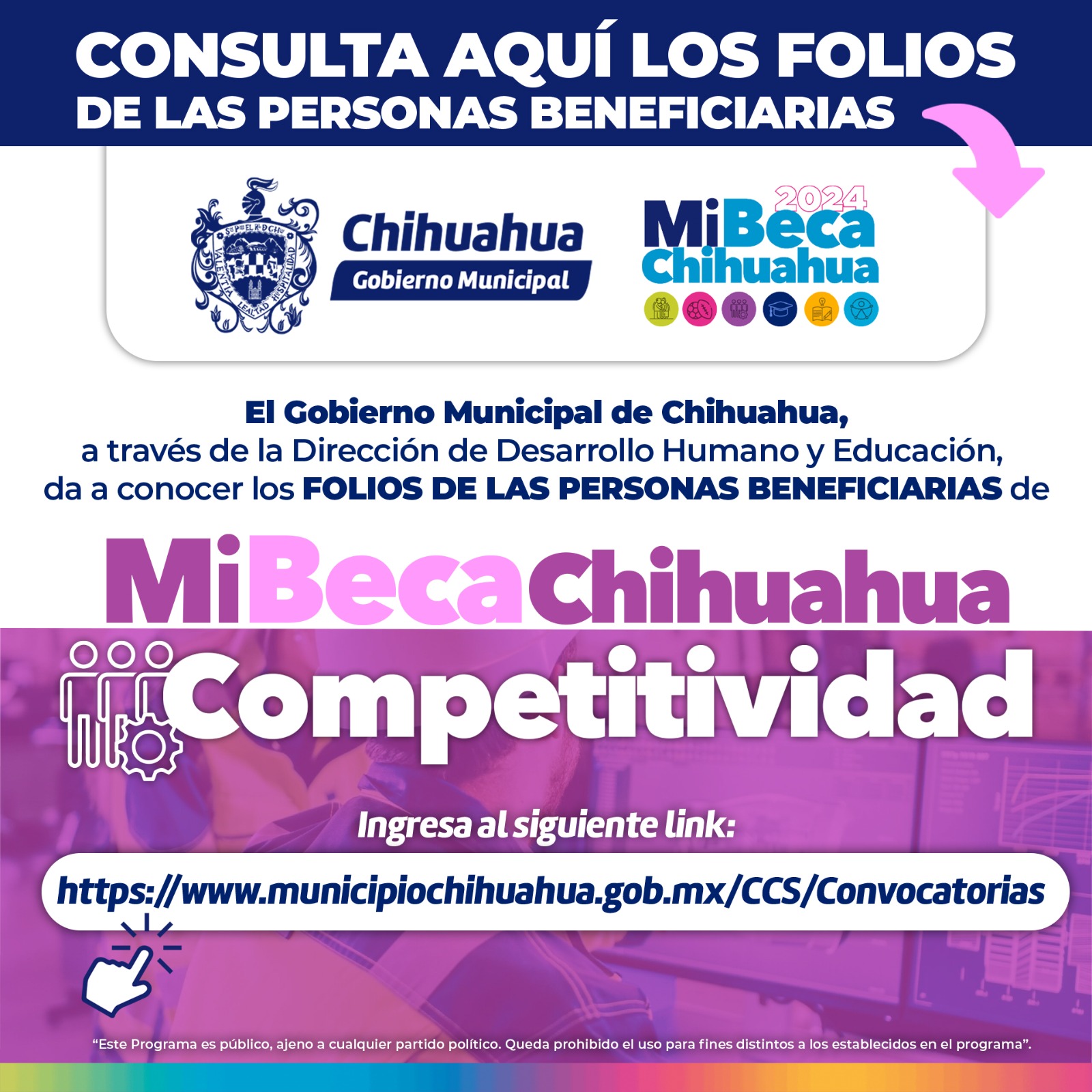 Chihuahua, Chih. A 07 de abril de 2024.-* El Gobierno Municipal, a través de la Dirección de Desarrollo Humano y Educación, da conocer a la población la lista de folios de las personas que fueron aceptadas del programa “Mi Beca Chihuahua Competitividad” edición 2024, la cual se puede consultar en la página: www.municipiochihuahua.gob.mx/CCS/Convocatorias y en los periódicos de mayor circulación.