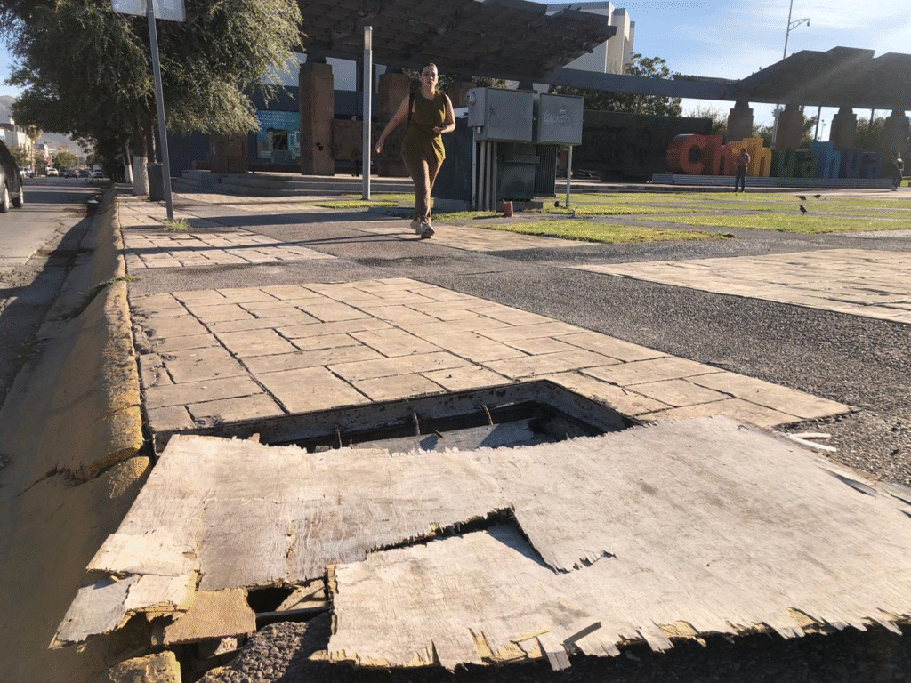 Se hace un llamado al Municipio de Chihuahua para que repare el registro y garantice la seguridad de los peatones que a diario circulan por este importante punto de la ciudad.