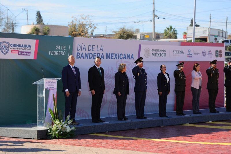 Chihuahua, Chih. A 24 de febrero de 2024.- El alcalde de Chihuahua, Marco Bonilla, acompañó al izamiento de la Bandera de México, en el marco de los festejos del 24 de febrero Día de la Bandera, en un evento en colaboración con la Secretaría de la Defensa Nacional (SEDENA) y el Gobierno del Estado.