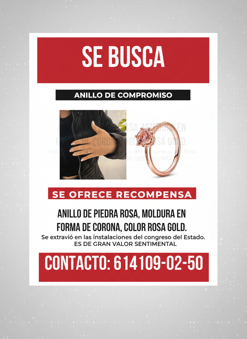 Un anillo de compromiso fue reportado como extraviado dentro de las instalaciones del Congreso del Estado, de acuerdo con un aviso difundido por la persona afectada. Se trata de un anillo con piedra rosa, montura en forma de corona y color rosa gold, descrito como una pieza de gran valor sentimental.