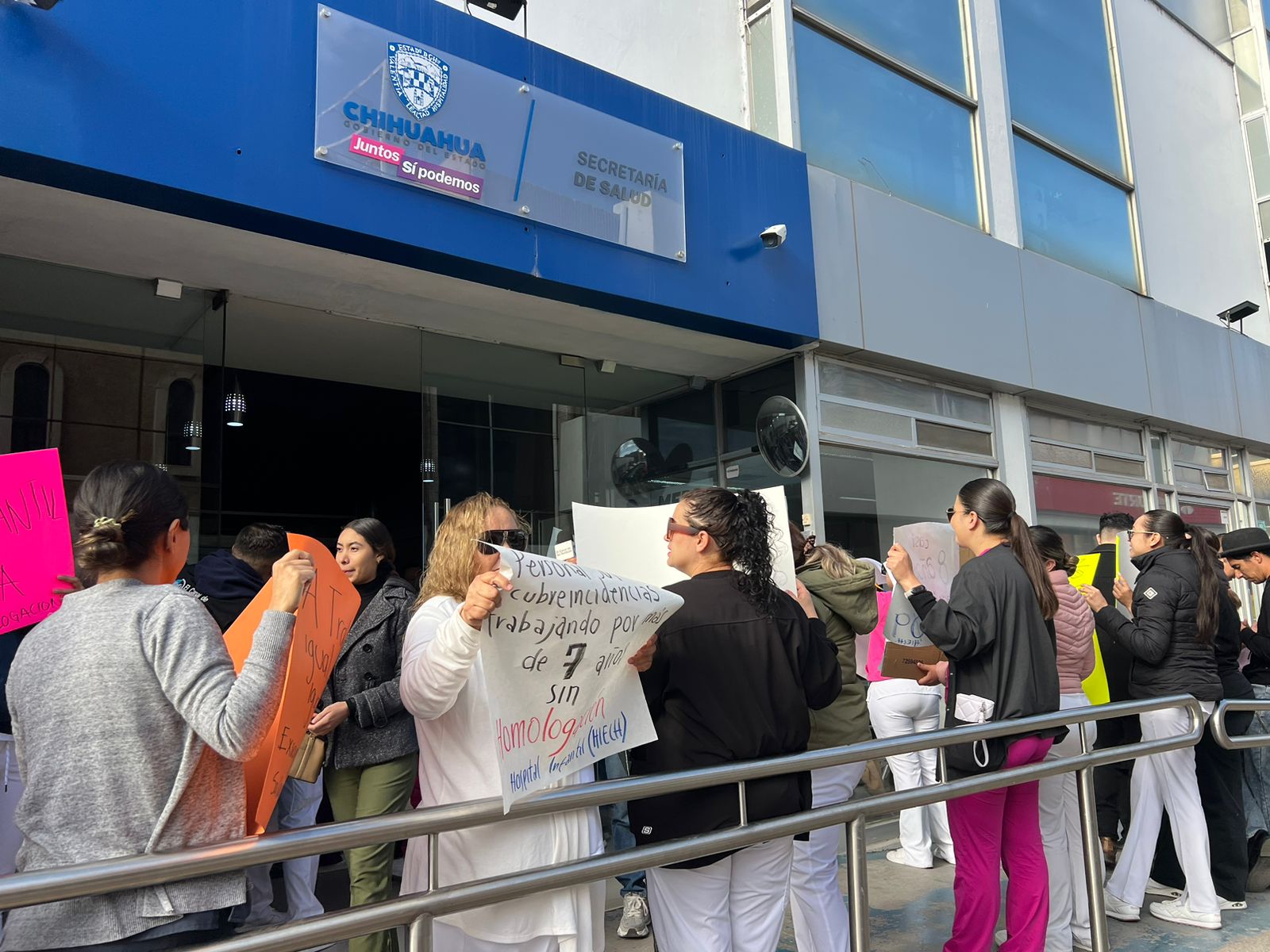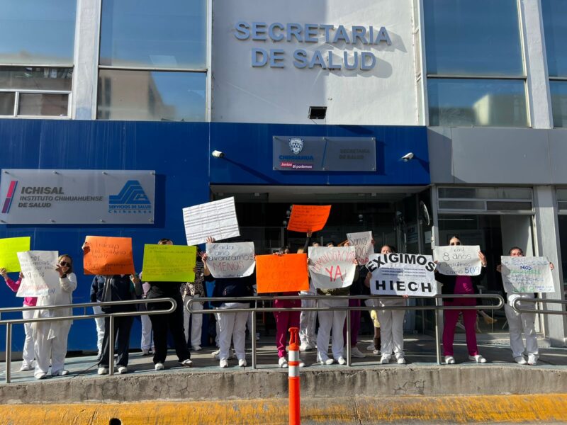 Un colectivo de 150 enfermeras del Hospital Infantil de Especialidades de Chihuahua se congregó este jueves frente a las instalaciones de la Secretaría de Salud, en el cruce de las calles Tercera y Aldama, para exigir la homologación de sus salarios y condiciones laborales.