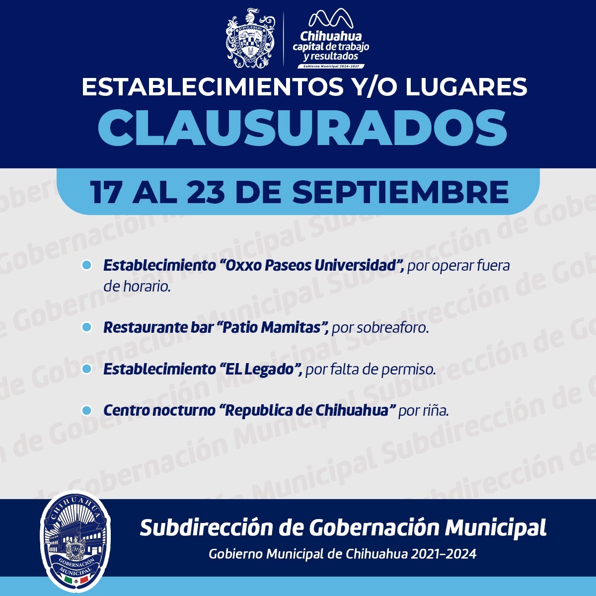 Chihuahua, Chih., a 23 de septiembre del 2024.- El Gobierno Municipal de Chihuahua, a través de la Subdirección de Gobernación de la Secretaría del Ayuntamiento, informa que del 16 al 22 de septiembre se realizaron 238 inspecciones a locales y establecimientos, resultando en 10 actas administrativas por la falta de documentación diversa, así como 4 clausuras en total.