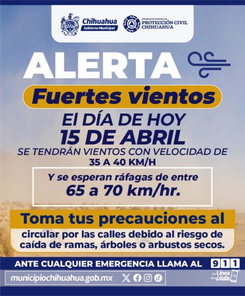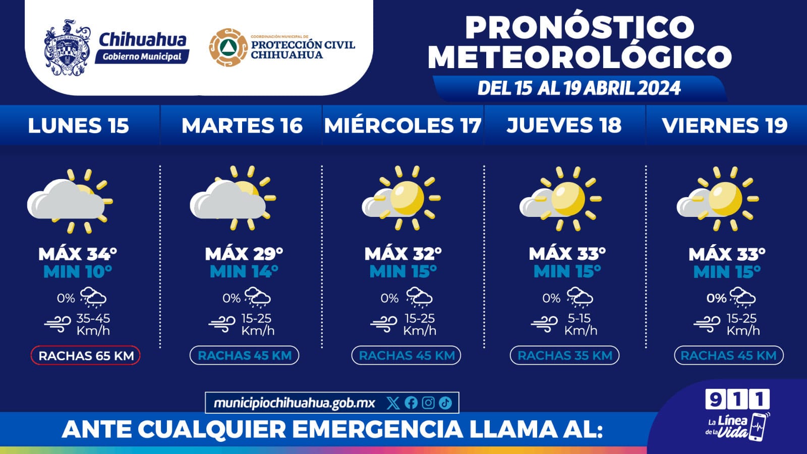 Chihuahua, Chih. A 15 de abril del 2024.- La Coordinación de Protección Civil Municipal informa que esta semana se pronostican temperaturas máximas de 34 °C con mínimas de 10°C, con vientos fuertes para este lunes en particular.