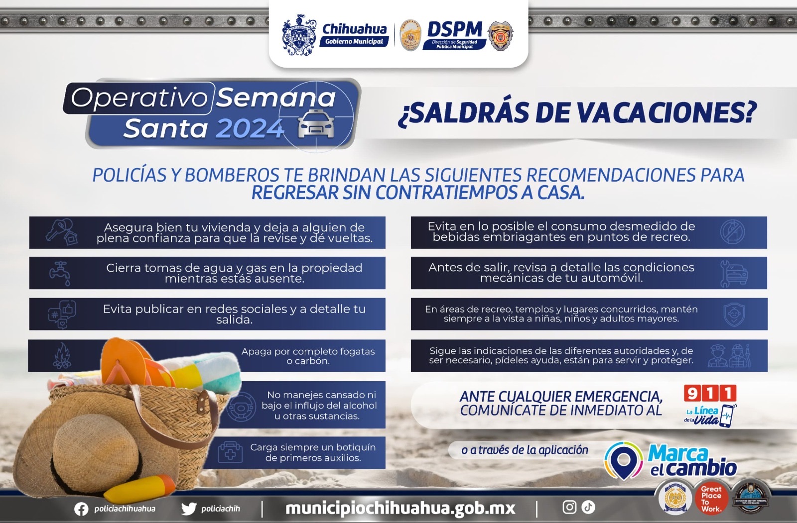 A pesar de que días atrás arrancó el Operativo Semana Santa 2024 en el municipio de Chihuahua, con un incremento del número de policías y bomberos que cuidarán de la ciudad y áreas más concurridas durante la temporada vacacional, es importante que las personas tomen sus propias precauciones para evitar incidentes tanto en el hogar como en los lugares de recreación o en las vialidades y carreteras.