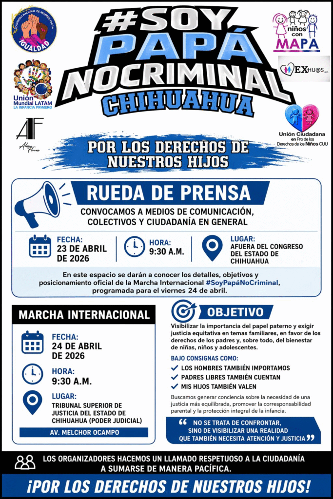 Este jueves 23 de abril, frente al Congreso del Estado de Chihuahua, en el Centro Histórico de la ciudad, padres de familia convocaron a una rueda de prensa para anunciar la Marcha Internacional #SoyPapáNoCriminal, programada para este viernes 24 de abril a las 9:30 horas. El recorrido iniciará en el Tribunal Superior de Justicia del Estado, ubicado en la Avenida Melchor Ocampo, y avanzará por las calles Ocampo, Aldama e Independencia, para finalizar en la Fiscalía de la Mujer.