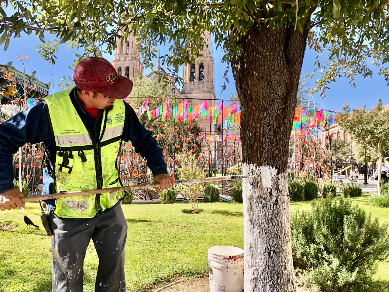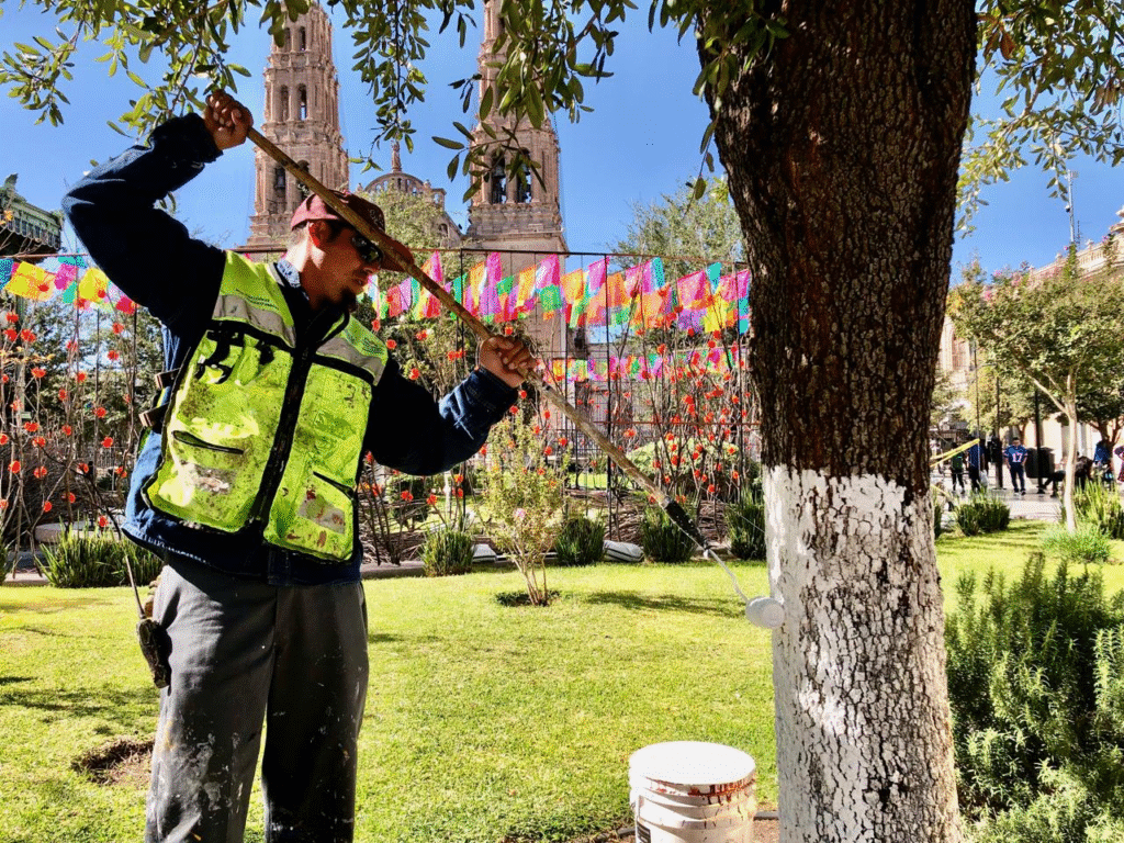 Trabajador municipal aplica cal y pintura en árboles del Centro Histórico para prevenir plagas