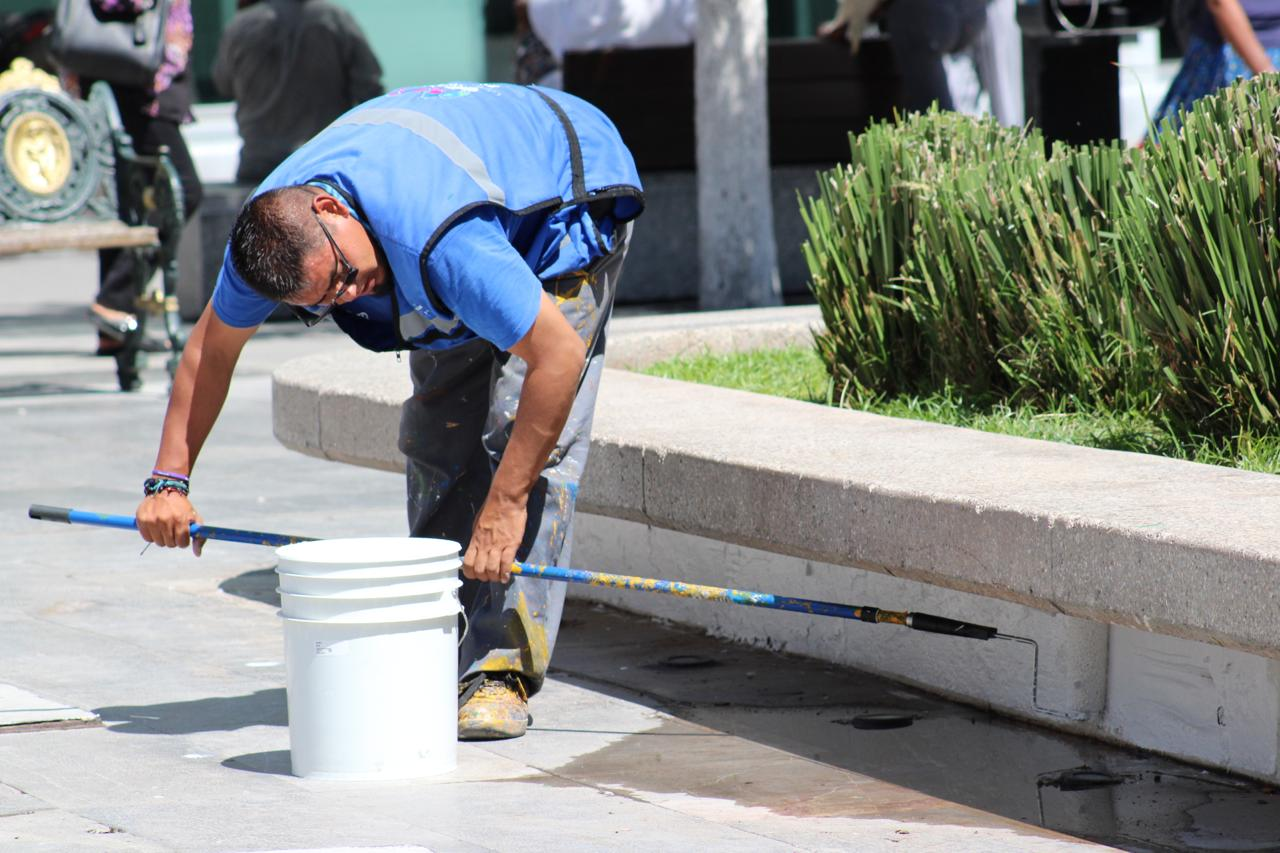 Trabajador municipal pinta jardineras de la Plaza de Armas con rodillo en mano