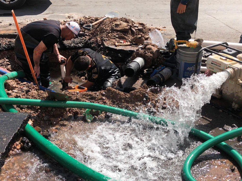 Personal de la Junta Municipal de Agua y Saneamiento (JMAS) labora en la reparación de una fuga de agua potable en la intersección de las calles Aldama y Vicente Guerrero, en el Centro de la ciudad. La fuga, de considerable tamaño, ha requerido que los trabajadores ingresen hasta medio cuerpo en la zanja para colocar la tubería dañada, mientras utilizan bombas para extraer el agua y facilitar las labores.
