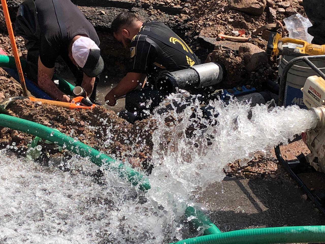 Personal de la Junta Municipal de Agua y Saneamiento (JMAS) labora en la reparación de una fuga de agua potable en la intersección de las calles Aldama y Vicente Guerrero, en el Centro de la ciudad. La fuga, de considerable tamaño, ha requerido que los trabajadores ingresen hasta medio cuerpo en la zanja para colocar la tubería dañada, mientras utilizan bombas para extraer el agua y facilitar las labores.