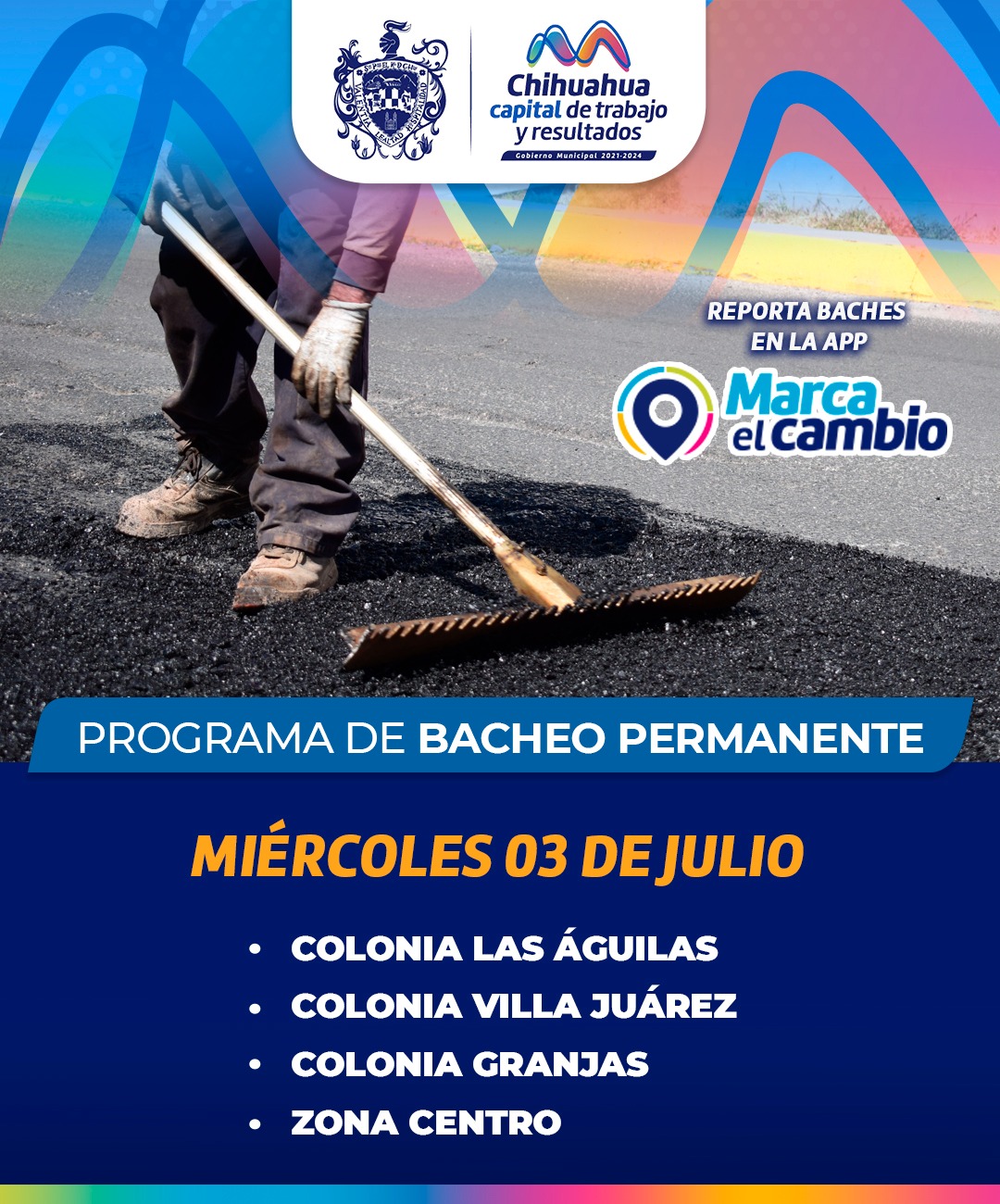 Chihuahua, Chih. A 03 de julio de 2024.- El Gobierno Municipal, a través de la Dirección de Obras Públicas, informa en las colonias Las Águilas, Villa Juárez, Granjas y Zona Centro; se tendrán labores de bacheo este miércoles 03 de julio.