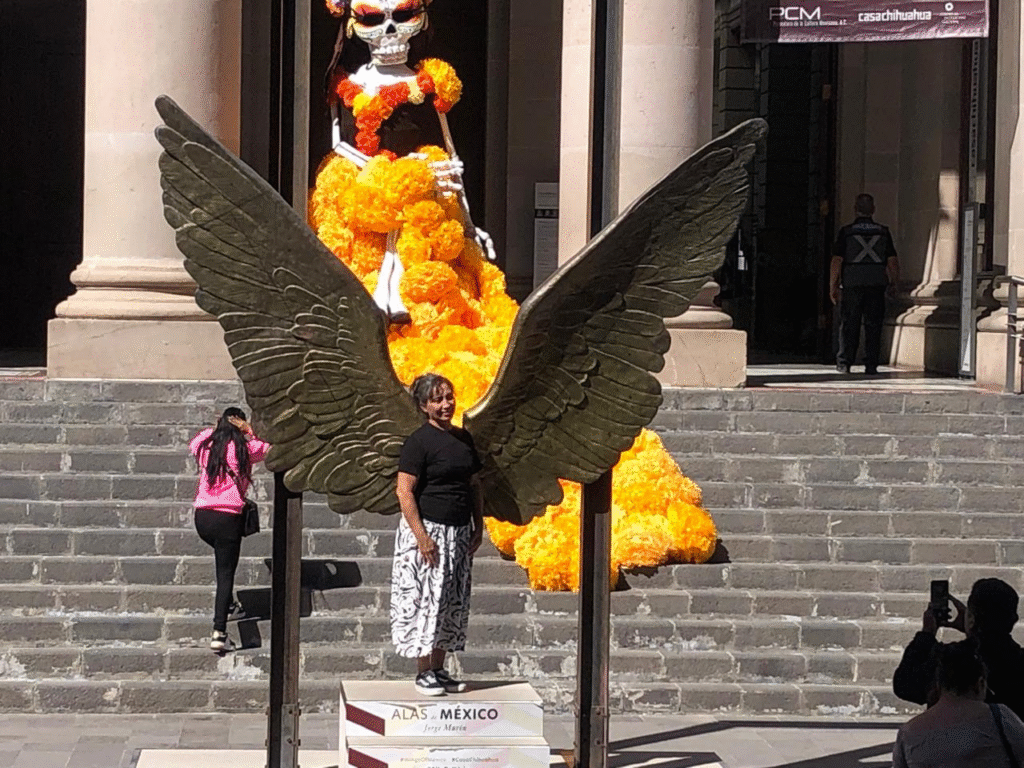 Familiares, turistas y locales no han dejado pasar la oportunidad de retratarse frente al Museo Casa Chihuahua, donde una Catrina gigante, vestida con un llamativo traje de flores de cempasúchil hechas de papel maché y otros materiales tradicionales, se ha convertido en el fondo perfecto para las fotos. La icónica figura, que destaca por sus colores naranja y blanco, complementa las ya famosas “Alas de México” del artista Jorge Marín se encuentran de forma permanente en la entrada principal del Centro de Patrimonio Cultural —una obra de metal que desde hace años atrae a visitantes para capturar recuerdos—.