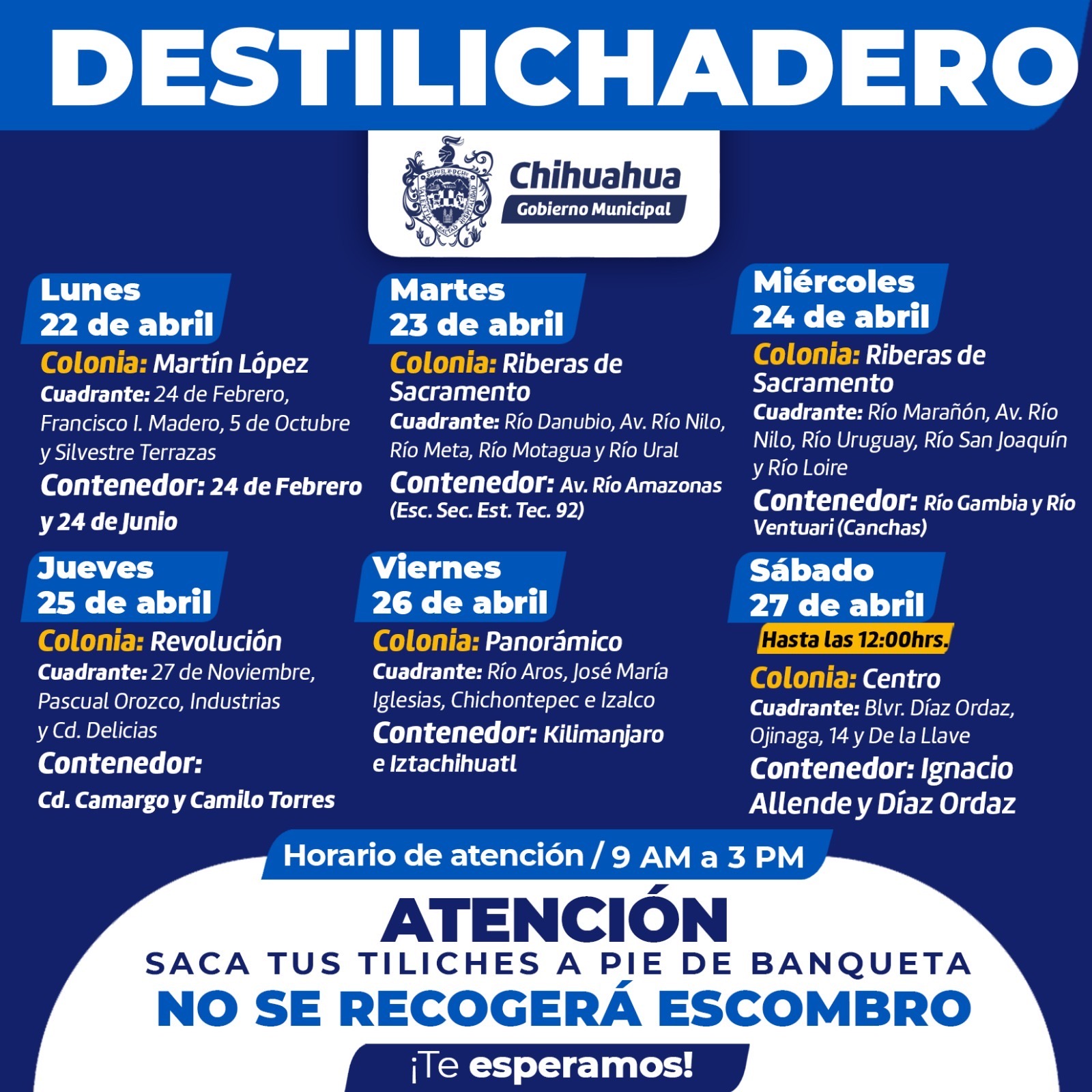 Chihuahua, Chih. A 20 de abril de 2024.-* Para evitar acumulaciones de basura de grandes dimensiones en las viviendas lo que podría generar plagas o problemáticas en la salud, el Gobierno Municipal, a través de la Dirección de Servicios Públicos Municipales, informa el calendario del programa Destilichadero, que se realizará del 22 al 27 de abril en cinco colonias de la Capital.