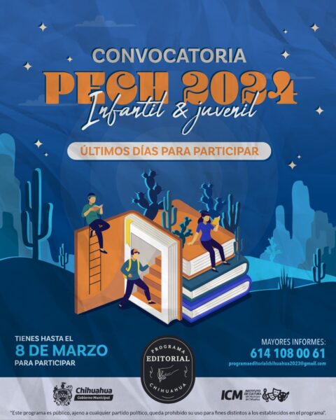 Chihuahua, Chih. A 5 de marzo de 2024.- El Gobierno Municipal de Chihuahua, a través del Instituto de Cultura del Municipio, recuerda la ciudadanía que el próximo 8 de marzo a las 16:00 horas es el último día para participar en el Programa Editorial Chihuahua (PECH) en su edición 2024.