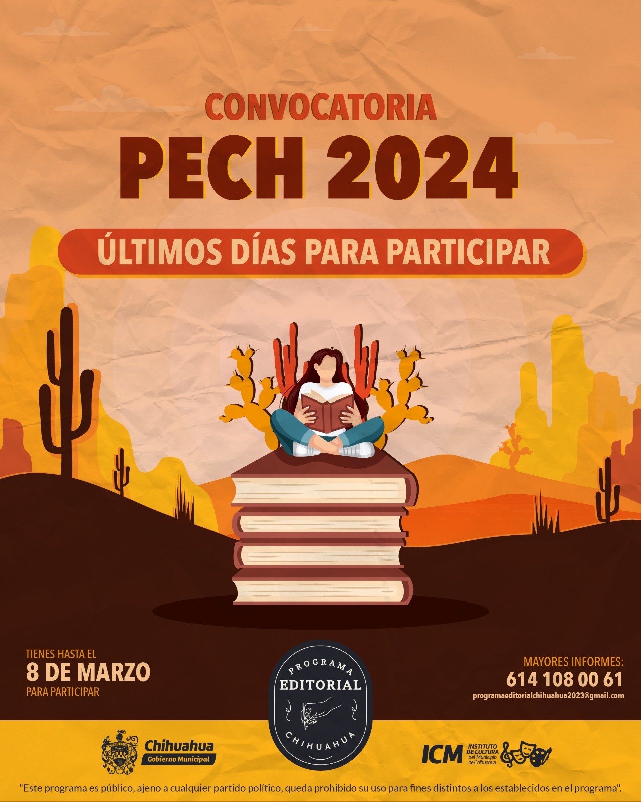 Chihuahua, Chih. A 5 de marzo de 2024.- El Gobierno Municipal de Chihuahua, a través del Instituto de Cultura del Municipio, recuerda la ciudadanía que el próximo 8 de marzo a las 16:00 horas es el último día para participar en el Programa Editorial Chihuahua (PECH) en su edición 2024.