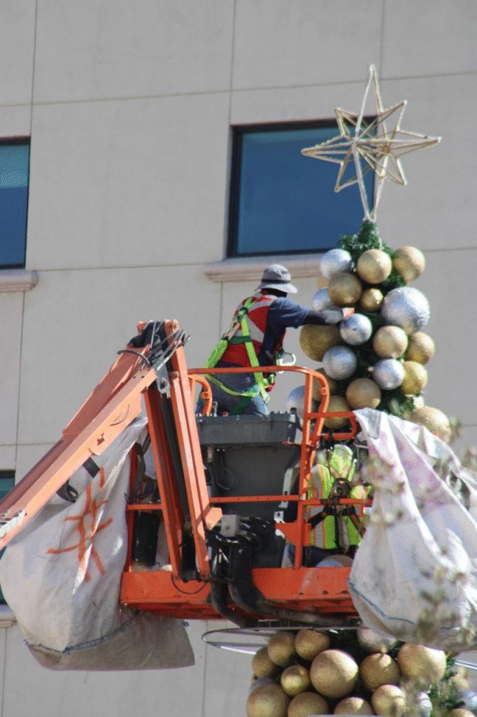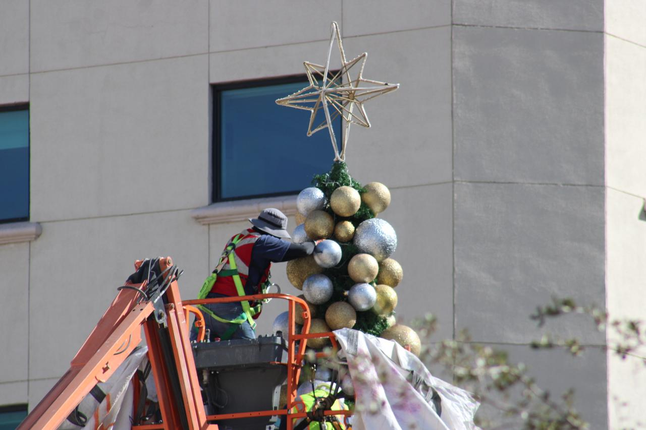 Los últimos detalles del árbol de Navidad instalado en la Plaza de Armas se realizan este sábado, donde trabajadores utilizan una grúa para colocar la estrella en la punta y las esferas decorativas en la parte más alta. Este montaje finaliza la preparación del árbol, que ayer fue objeto de pruebas técnicas para garantizar su correcto funcionamiento durante el encendido oficial, programado para el próximo viernes 5 de diciembre a las 19:00 horas.