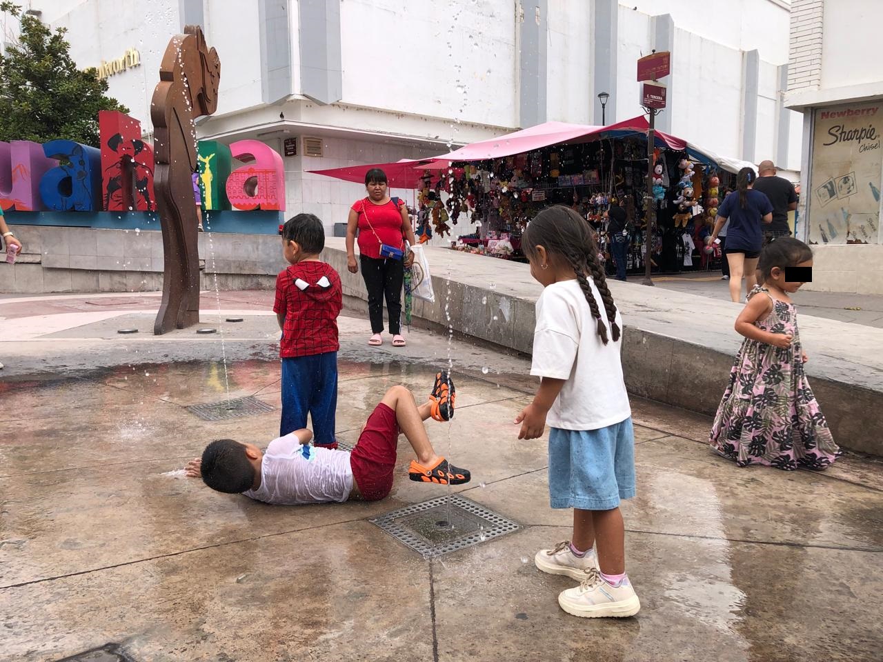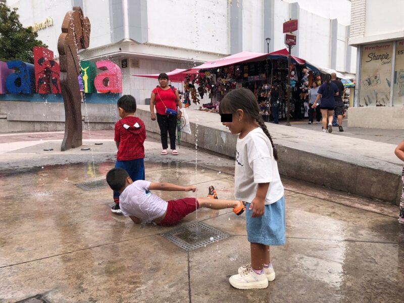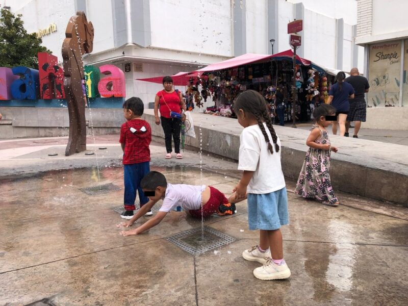 En un día donde el cielo oscila entre soleado y nublado, pero con el termómetro marcando 34 grados a la sombra, el ambiente en el centro histórico de Chihuahua es de calor sofocante. A pesar de los pronósticos de lluvia, el sol asoma con fuerza, creando un ambiente perfecto para buscar refugio en el agua. En la intersección de la calle Victoria y la calle 3era, justo donde se alzan las icónicas letras de “CHIHUAHUA”, un grupo de niños ha encontrado el refugio perfecto contra el calor: las fuentes de piso.