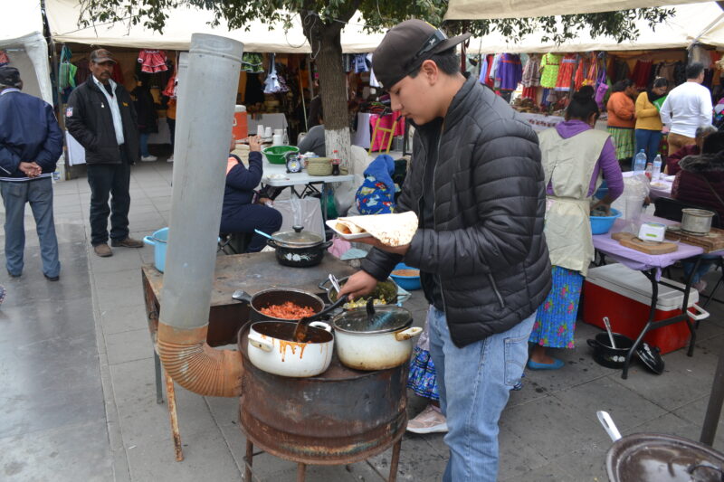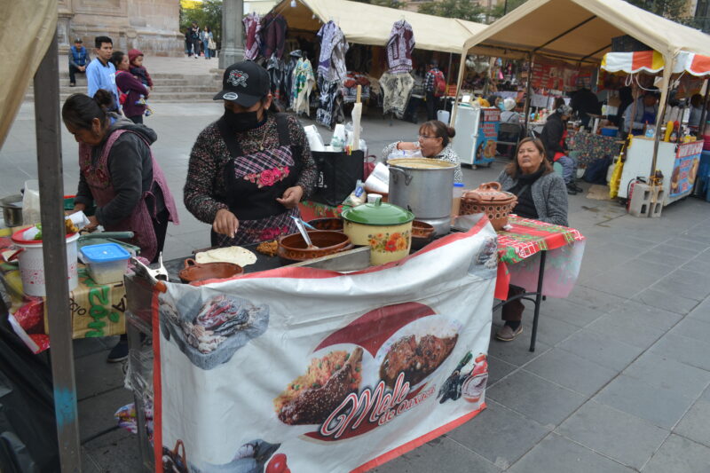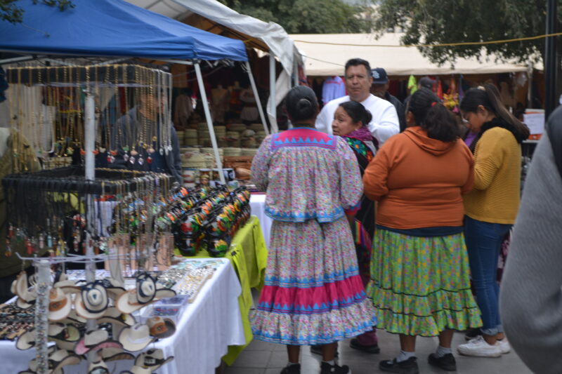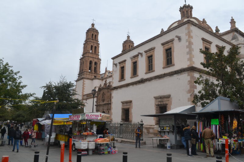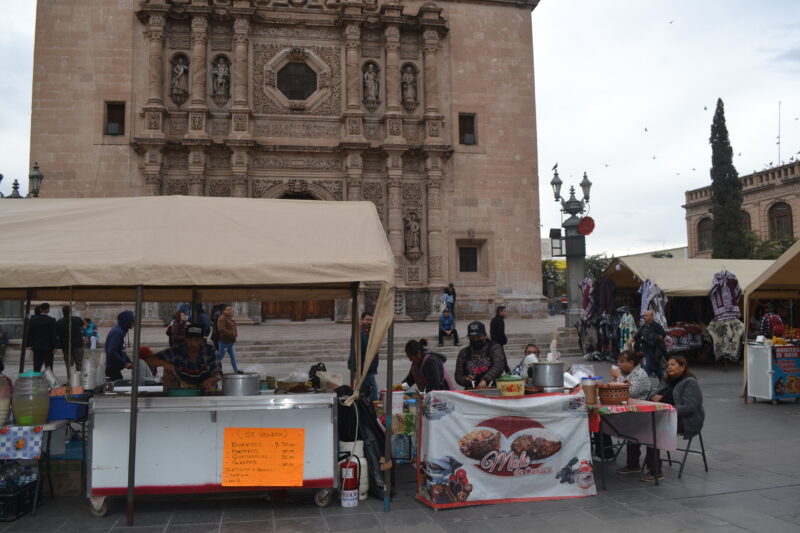 Continuamos nuestro recorrido hacia la Catedral de Chihuahua, que se encontraba en misa, por lo que decidimos guardar respeto a los asistentes y no interrumpir, a los alrededores de la misma se concentró un buen número de puestos de comida, artesanías y demás como ocurre cada año con dicha exposición comercial; el ambiente es inmejorable ya que en cada puesto de comida, las orillas son hechas a mano para los burritos y gorditas, gente por doquier disfrutando del día, haciendo a un lado sus preocupaciones solo por ese momento para degustar un champurrado a un costado de la estatua de Antonio Deza y Ulloa; a pesar de estar a unos metros de edificios gubernamentales, no hay rastro de políticos posando para la fotos, dando la mano de ancianos que nunca volverán a ver en su vida o llamando la atención tirando volantes por las calles a diestra y siniestra.