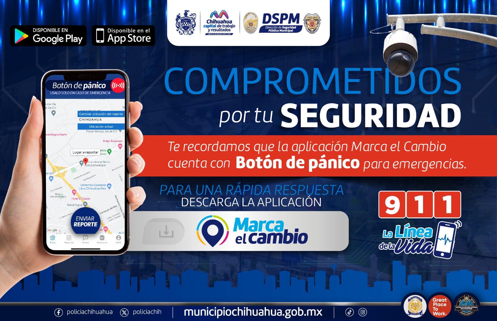 *_Chihuahua, Chih. A 14 de diciembre de 2024_*.- Como una opción alterna al número de emergencia 9-1-1 y la Red Vecinal, el Gobierno Municipal pone a disposición de la ciudadanía el botón de pánico dentro de la aplicación Marca el Cambio, que al ser presionado recibe respuesta rápida a emergencias por parte de la Policía Municipal.