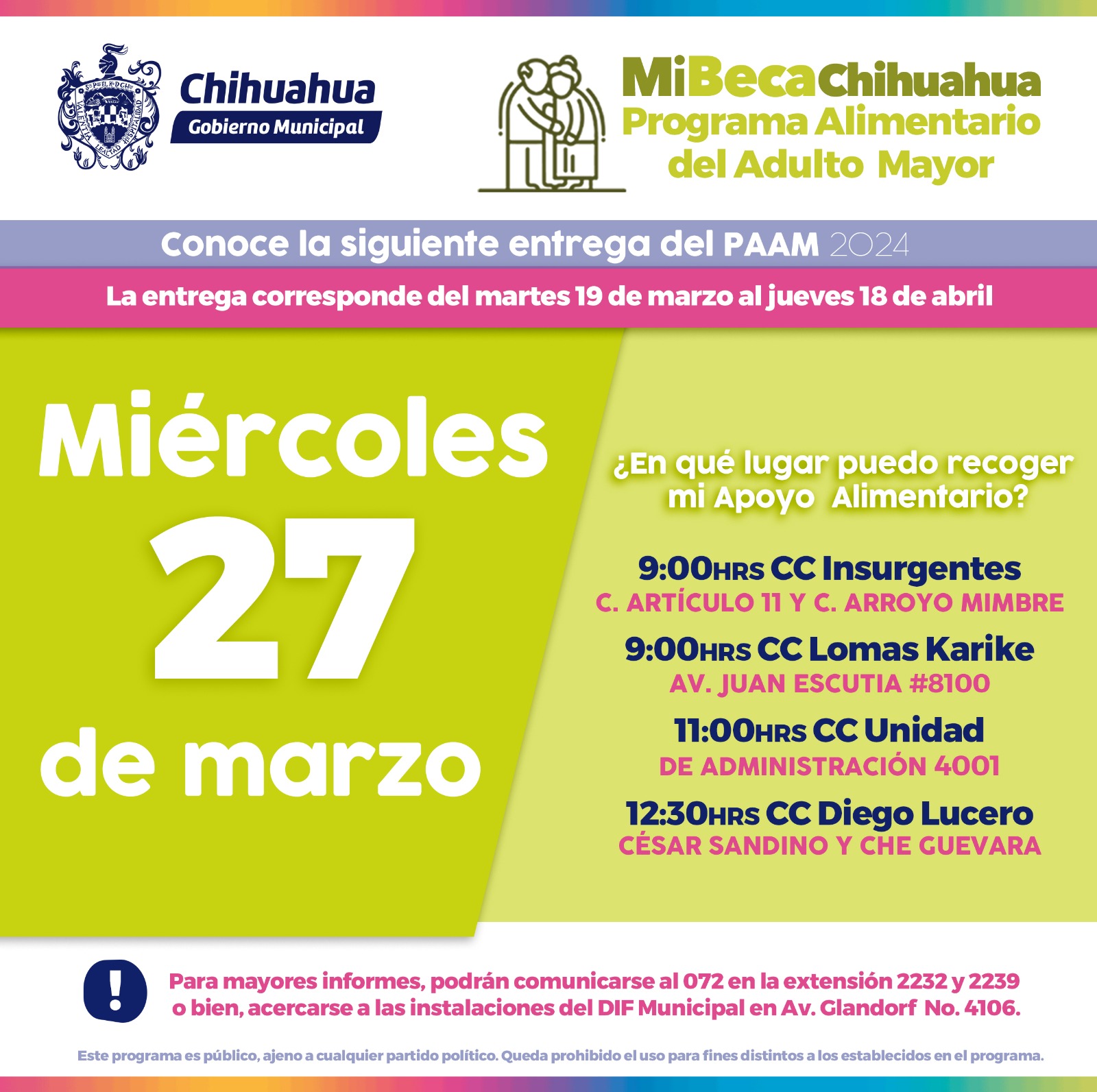 Chihuahua, Chih. A 26 de marzo de 2024.- El Gobierno Municipal, a través del DIF, informa a las y los seleccionados del Programa Alimentario del Adulto Mayor (PAAM) que podrán acudir por su paquete alimentario del este miércoles 27 de marzo en los siguientes centros comunitarios: