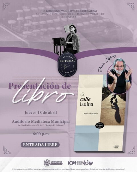 Como la presentación de libro “La calle ladina” de Jesús Chávez Marín, seleccionado del Programa Editorial Chihuahua 2024, que será este este jueves 18 de abril a las 6:00 de la tarde, en el Auditorio de la Mediateca Municipal, ubicada en avenida Teófilo Borunda #1617, en las inmediaciones del parque El Palomar.