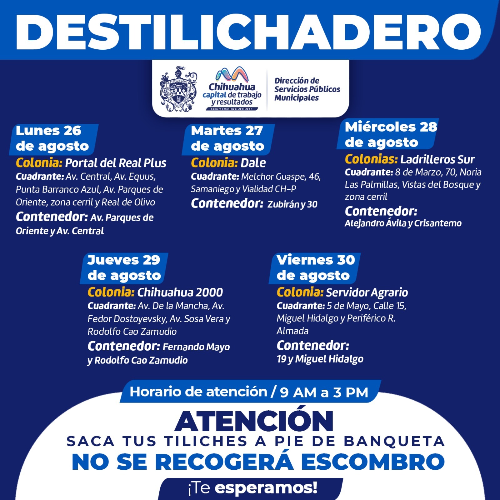 Chihuahua, Chih. A 24 de agosto de 2024.- Para evitar acumulaciones de basura de grandes dimensiones en las viviendas, que podría generar plagas o problemas de salud, el Gobierno Municipal, a través de la Dirección de Servicios Públicos Municipales, informa el calendario del programa Destilichadero, que se realizará del 26 al 30 de agosto en cinco colonias de la Capital.