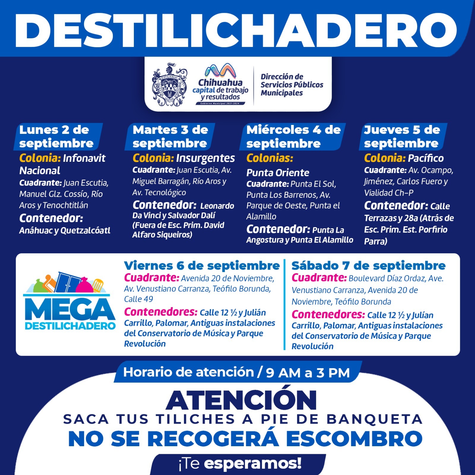 Chihuahua, Chih. A 30 de agosto de 2024.- Para evitar acumulaciones de basura de grandes dimensiones en las viviendas, que podría generar plagas o problemas de salud, el Gobierno Municipal, a través de la Dirección de Servicios Públicos Municipales, informa el calendario del programa Destilichadero, que se realizará del 02 al 07 de septiembre en cuatro colonias de la Capital, además de un mega operativo en el Centro Histórico de la ciudad.