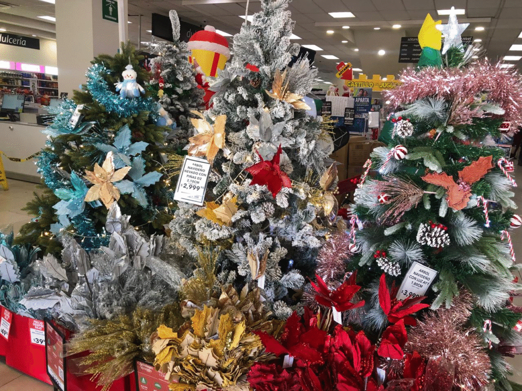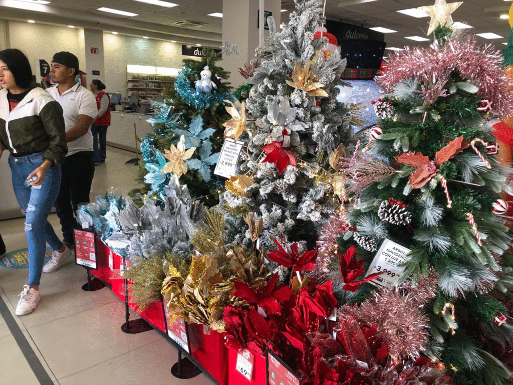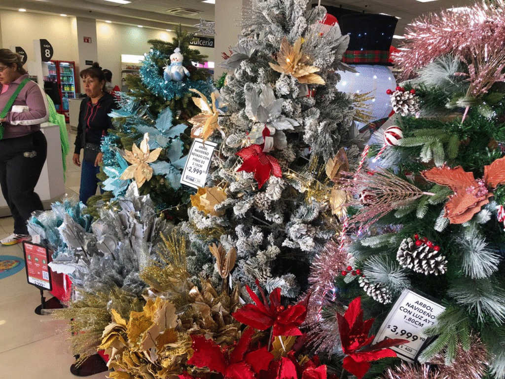Desde pequeños arbolitos iluminados hasta guirnaldas y figuras decorativas, los comercios buscan atraer a los primeros compradores, mezclando —por unos días— las tradiciones de Muertos y Navidad. Mientras algunos rincones aún conservan elementos de la celebración de noviembre, los escaparates ya reflejan el brillo de diciembre.