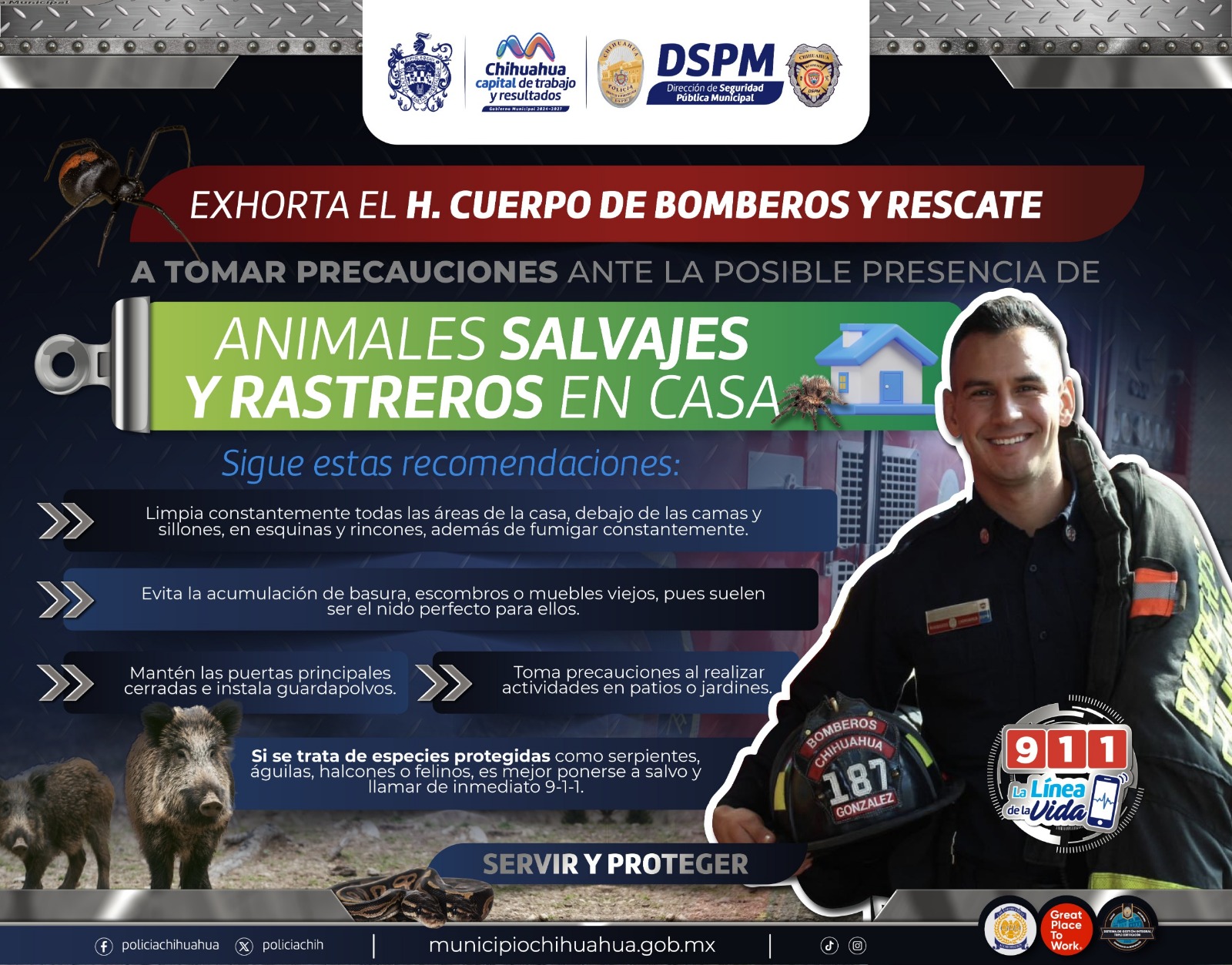 ***_H. Ciudad de Chihuahua, Chih. A 13 de junio de 2025_*.- Por la llegada de las primeras lluvias y a las altas temperaturas, el Heroico Cuerpo de Bomberos y Rescate del Municipio, pide a la comunidad tener precauciones con la aparición de animales silvestres, rastreros y/o ponzoñosos que suelen llegar a los hogares en busca de agua o refugio.