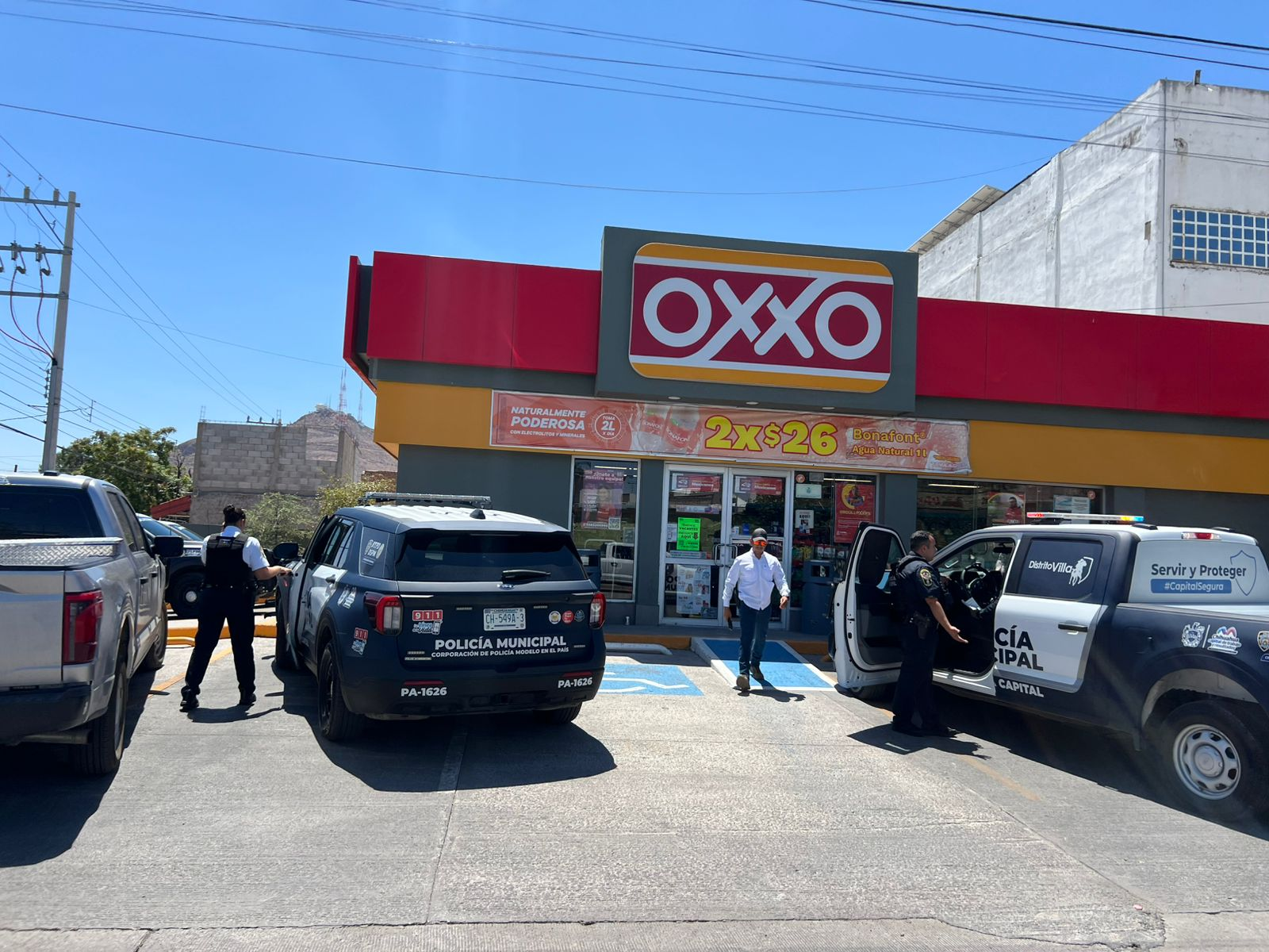 Esta mañana se registró un asalto en una tienda Oxxo ubicada en la intersección de calles Escudero e Industriales, en la colonia Industrial de la ciudad de Chihuahua.