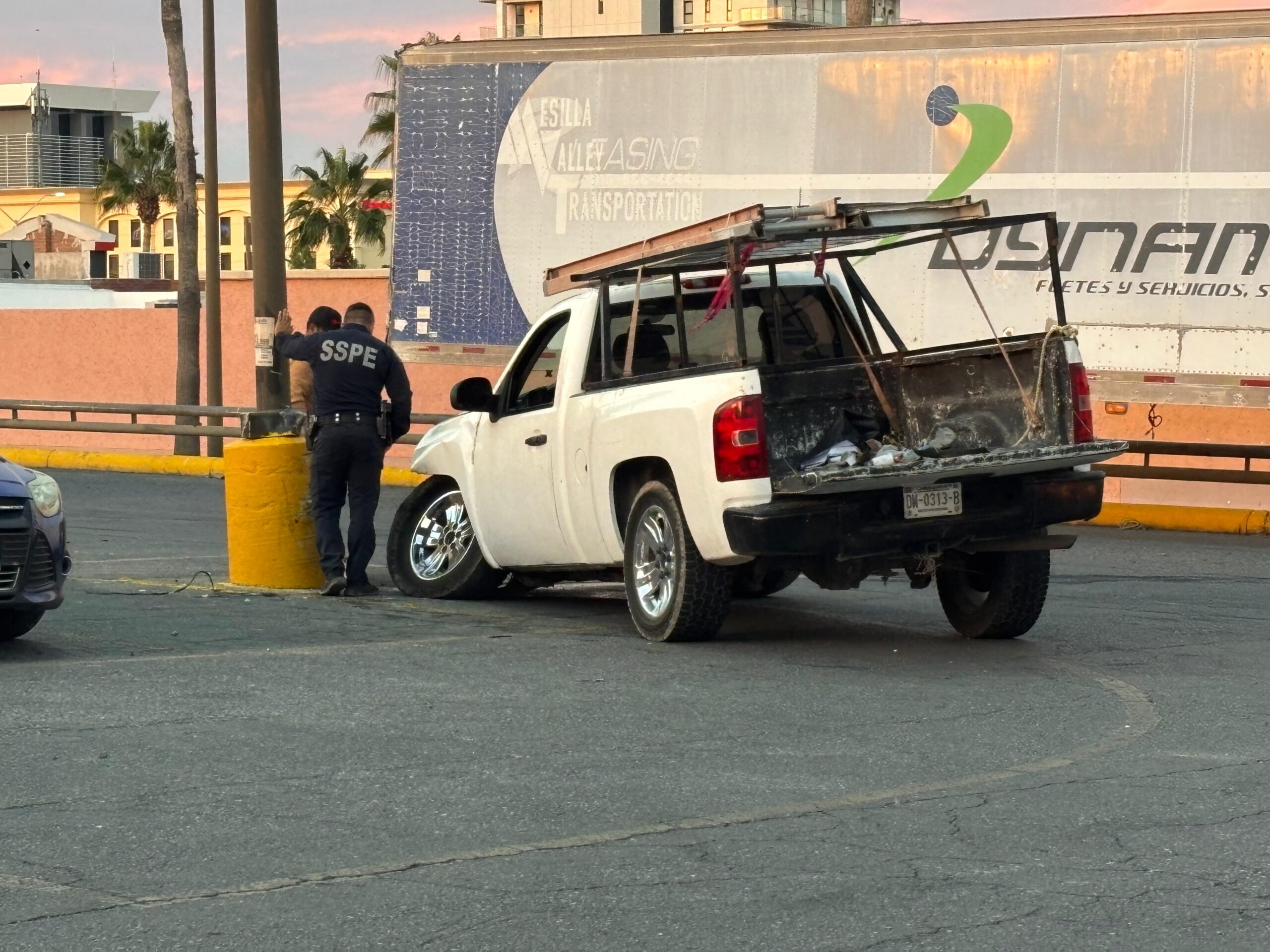 El incidente ocurrió cuando el automovilista realizaba una maniobra para girar a la izquierda dentro del área de estacionamiento. De forma repentina, la rótula de la suspensión delantera se desprendió, provocando que el conductor perdiera por completo el dominio del vehículo. Tras la falla mecánica, la parte frontal izquierda del automóvil se impactó directamente contra un poste metálico, el cual presentó una fractura visible en su base debido al golpe.