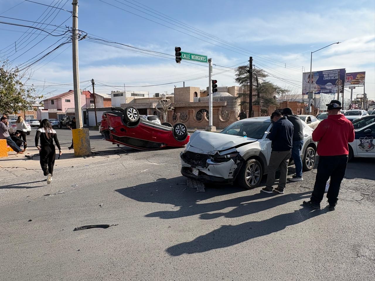 Tras el impacto, la camioneta Chirey volcó sobre su toldo y posteriormente se proyectó contra un poste, lo que generó la movilización de cuerpos de emergencia.