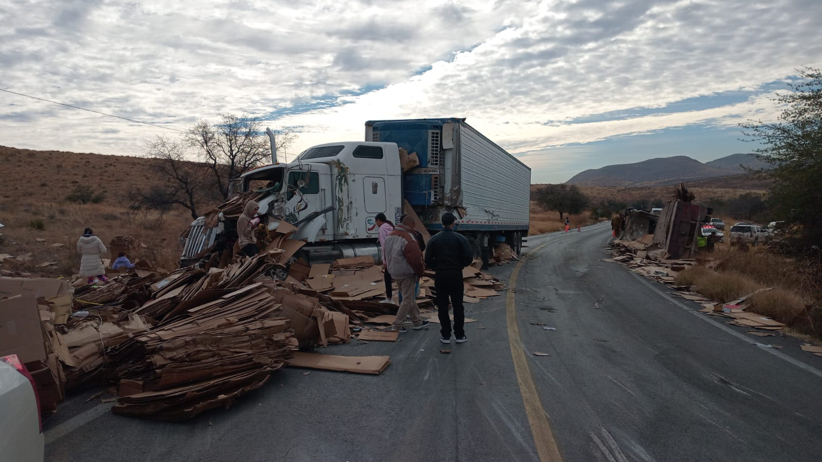 Como consecuencia del impacto, uno de los tráileres terminó volcado sobre la carretera. La carga de este vehículo, consistente en pacas de cartón, quedó esparcida sobre la carpeta asfáltica, lo que complicó el tránsito en la zona.
