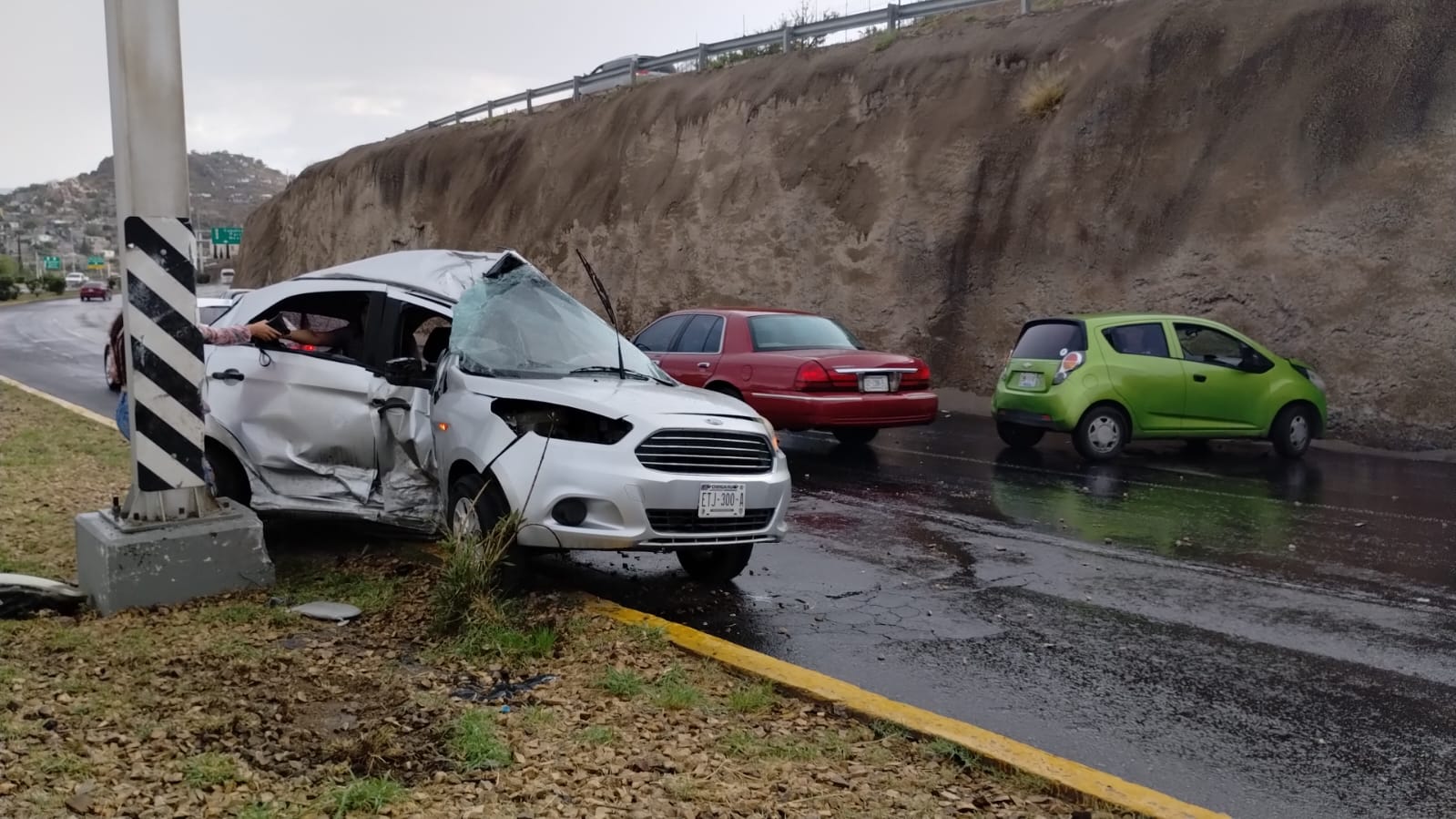 Un fuerte choque ocurrió la tarde de este sábado en el Periférico de la Juventud y casi Politécnico Nacional. El conductor de un Ford, Figo, derrapó y chocó primero a un Spark y posteriormente de costado contra un señalamiento vial.