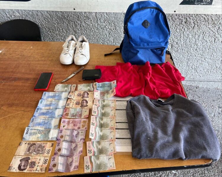 Al observar las unidades de la Policía Municipal, el sujeto toma una actitud sospechosa y evasiva, por lo que se detiene a quien se identifica como Manuel S. C. de 29 años. Al realizarle una inspección, se localiza en el interior de la mochila dinero en efectivo, un par de tenis color blanco, un cuchillo de cocina y una sudadera color gris.
