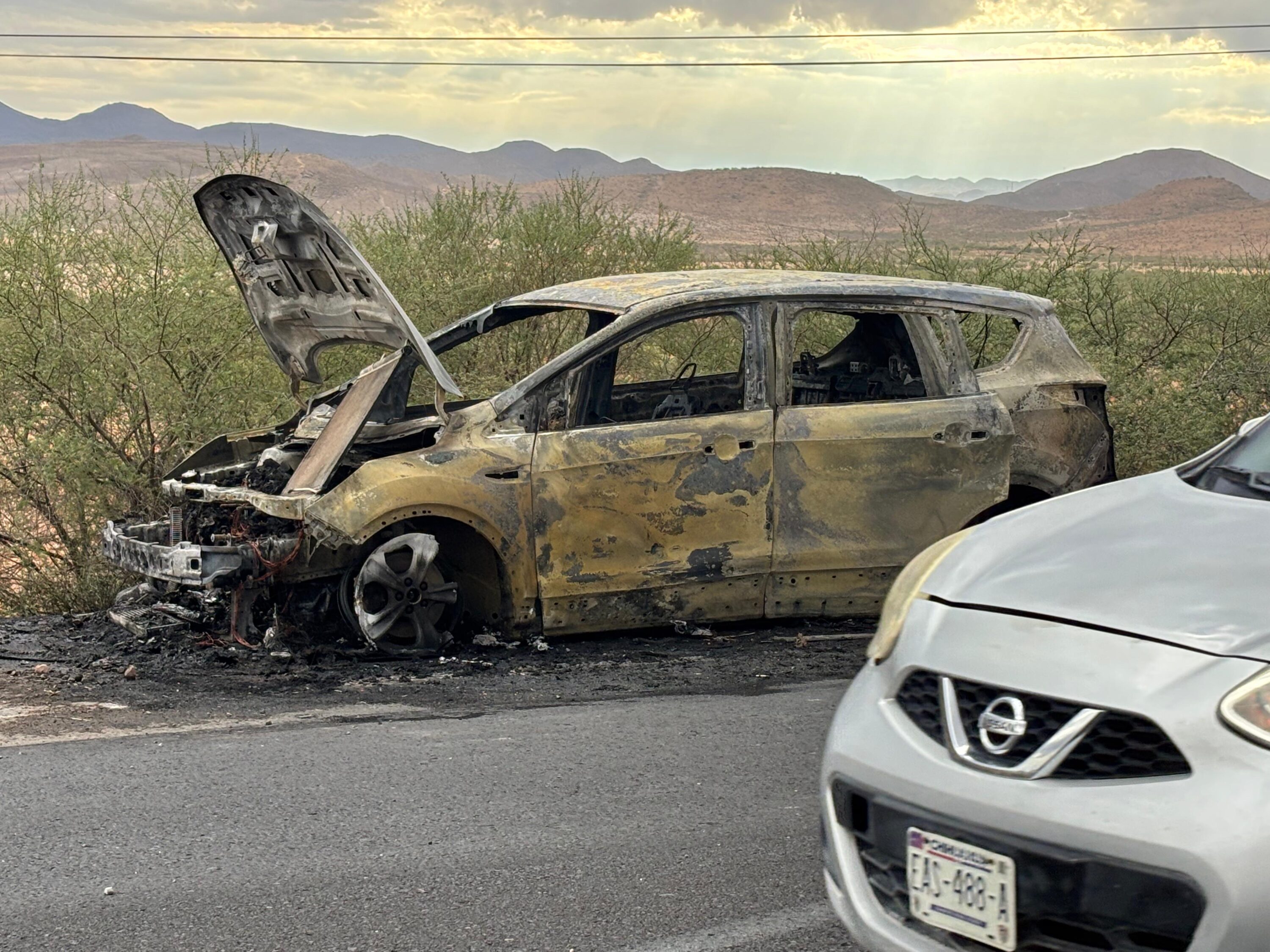 Una camioneta Ford, Escape quedó consumida en su totalidad, luego de incendiarse a la altura del kilómetro 204 de la carretera Delicias.