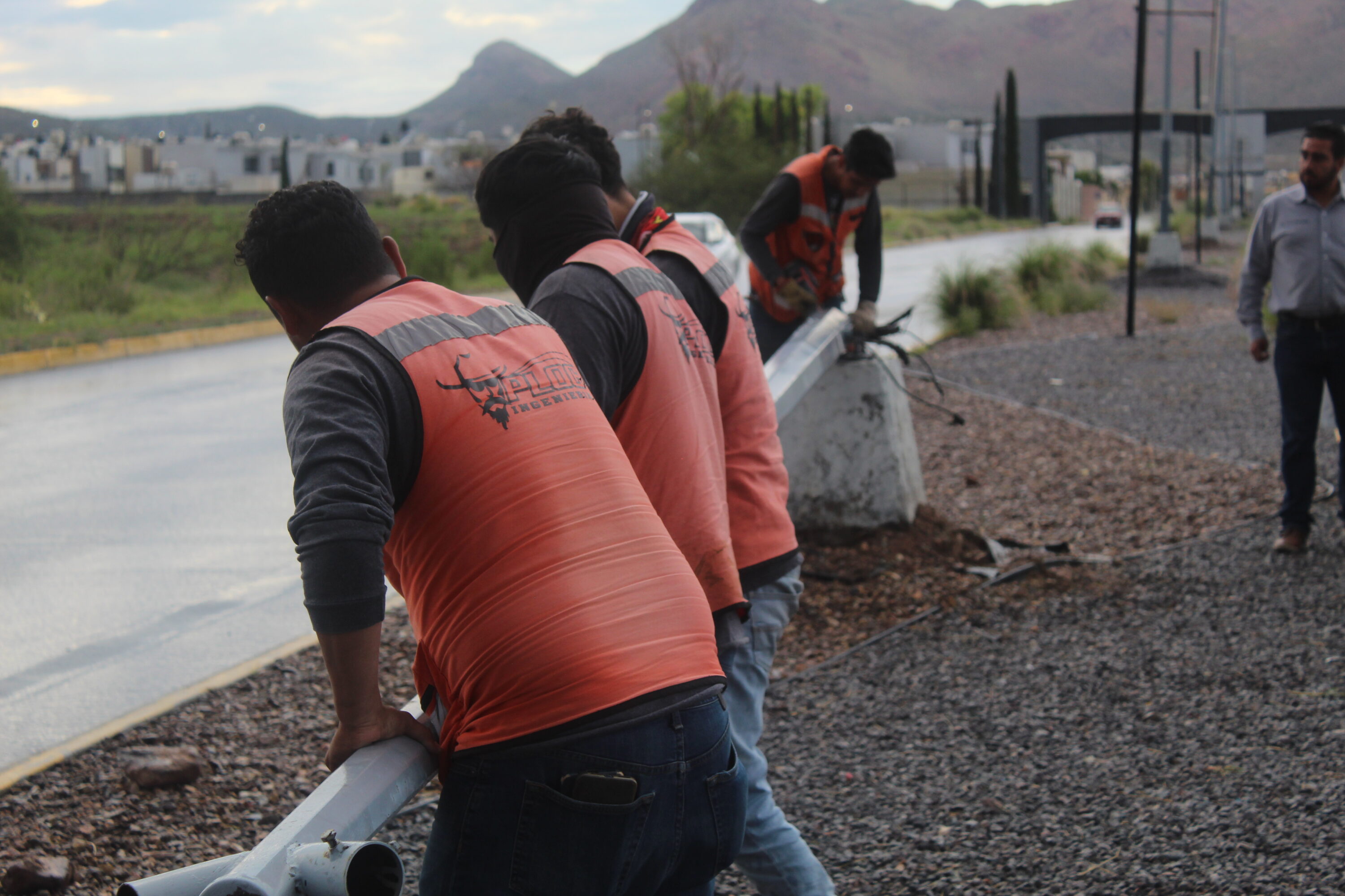 Los vientos y fuerte lluvia registrados durante esta tarde, provocaron la caída de un poste de alumbrado público en el camellón central de la avenida Romanzza.
