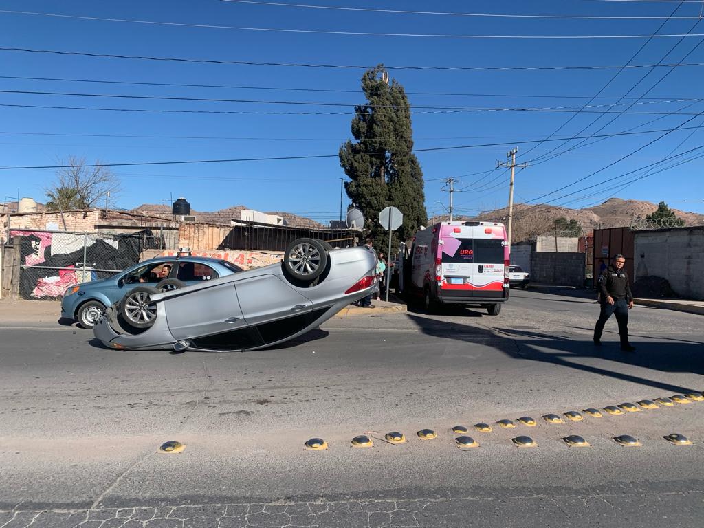 El conductor de un automóvil Hyundai, Sonata, volcó, cuando circulaba por la avenida Venceremos, al norte de la ciudad de Chihuahua, tras estallarle un neumático.